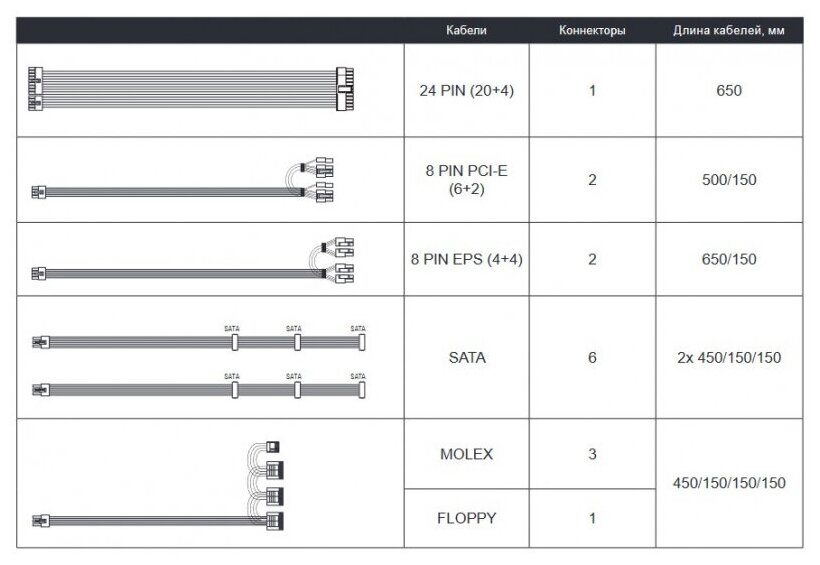 | Разъемы | MB 24 pin, CPU 4+4 pin, питание видеокарты 2х(6+2) pin, SATA 6 шт, Molex 3 шт, FDD 1 шт |
