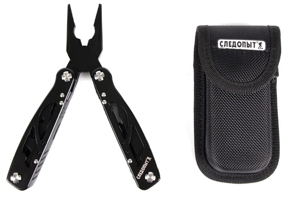 Универсальный мультитул Следопыт HEADWAY 11 предметов.Представляет собой компактный многофункциональный инструмент, который можно применять для выполнения широкого набора функций. Основным достоинством этого прибора является высокая универсальность. При своих малых габаритах оно может заменить целый ящик различных узкоспециализированных инструментов.Мультипул изготовлен из комплектующих высочайшего качества, которые сделаны из прочной нержавеющей стали. Режущие кромки ножей остро заточены, а эргономичная рукоятка обеспечивает удобство и безопасность использования изделия.Изготовлен из коррозионно-стойкой жаропрочной стали 420 марки с химико-термической обработкой и азотированием поверхности. Сталь имеет высокую твердость, устойчивость к повреждениям. Чехол из армированного полиэстера можно закрепить на поясном ремне.В состав мультитула входят следующие инструменты: тонконосые плоскогубцы, плоскогубцы, резак для проволоки, нож с серейтором, консервный нож, открывашка для бутылок, плоская отвертка, квадратная отвертка, набор бит - 10 шт (переходник с магнитом и 9 бит: шестигранники HEX 3,4,5 мм, прямая отвертка 0,6х3 мм, прямые отвертки 3,5,7 мм, крестовая отвертка PH1, PH2, PH3).Вес мультитула 218 г.Габаритные размеры набора инструментов в транспортном положении 112х35х21 мм.Длина с ножом в рабочем положении 195 мм.Длина лезвия 80 мм.Длина серейтерной части лезвия 30 мм.КомплектацияМультитул Следопыт - 1 шт. Чехол - 1 шт.
