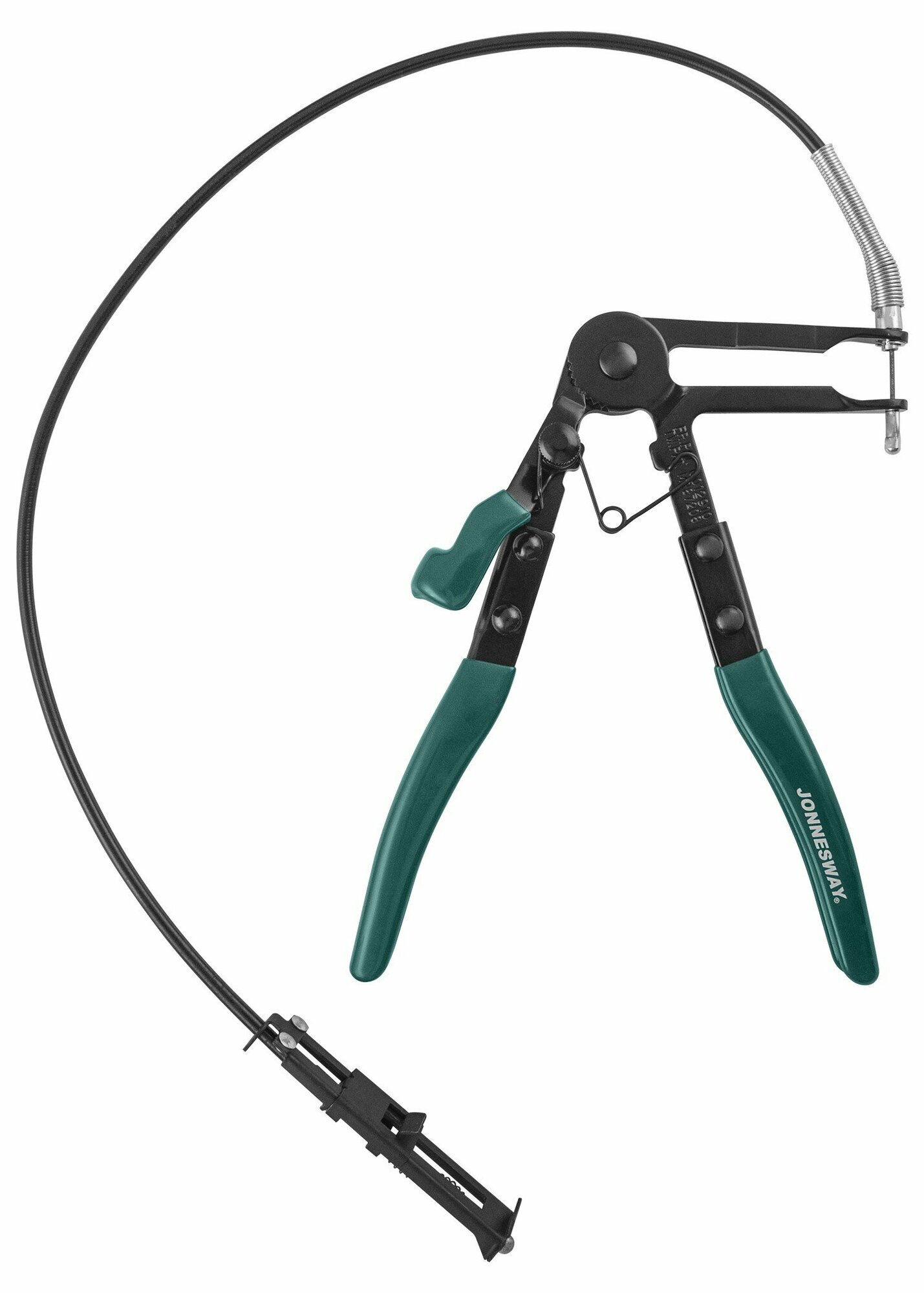 Специальный инструмент с зажимом, установленным на гибком тросе, длиной 700 мм, позволяющим использовать изделие для снятия плоских пружинных хомутов систем охлаждения в крайне осложненных и скрытых местах подкапотного пространства. Приспособление идеально подходе при обслуживании автомобилей группы VAG и PORSCHE. Рукоятки инструмента снабжены фиксатором положения зажима, освобождающим оператора от необходимости постоянно их удерживать. Изделие изготовлено из стали, имеет защитное покрытие - фосфатирование и обливные ПХВ чехлы рукояток.