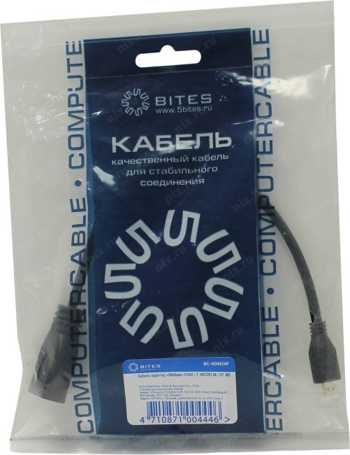 5bites HDMI F / micro HDMI M v1.4b BC-HDM2AF - переходник предназначен для подключения устройства с выходом micro HDMI (планшета, смартфона, фотоаппарата, видеокамеры и т.п.) к монитору, телевизору или др. устройству со входом HDMI