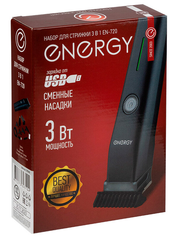При помощи машинки для стрижки волос Energy можно постричь волос по всей длине или подравнять виски в домашних условиях. Лезвия из нержавеющей стали надолго остаются острыми, обеспечивая превосходные результаты стрижки. В комплекте с данной моделью идут 4 насадки: 3, 6, 9, 12 мм, а также масло для ухода за лезвием, расческа и щеточка для чистки. Благодаря компактным размерам прибор удобно хранить и можно брать с собой в дорогу.