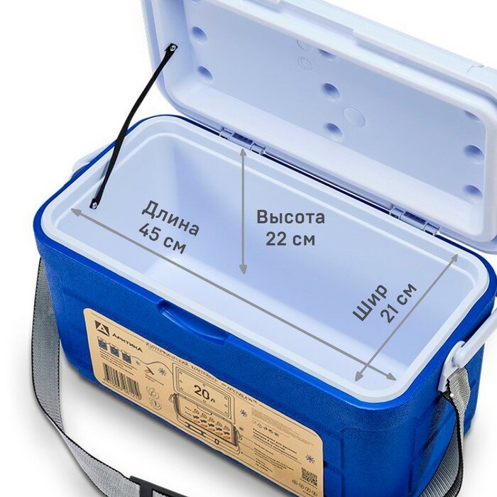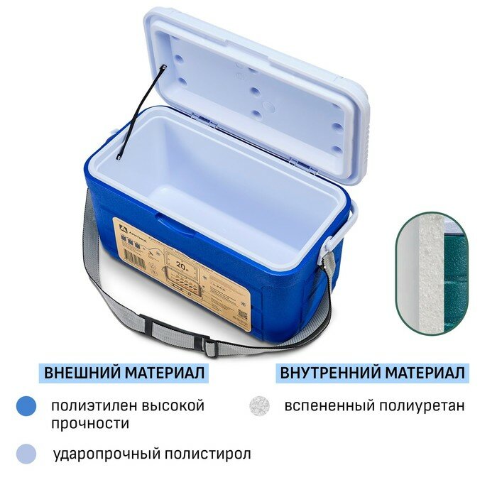 Изотермический контейнер из ударопрочного пластика.Рекомендуется для дальних поездок в качестве мобильного холодильника. Особенно актуально для тех, кто проводит вне дома длительное время, так как контейнер способен сохранять низкую температуру продуктов до 48 часов. Внешний корпус контейнера сделан из противоударного прочного пластика, внутренняя поверхность — из пищевого пластика. Межстенное пространство заполнено полиуретаном, который обладает низкими показателями теплопроводности, что обусловливает его высокие теплоизоляционные свойства по сравнению с традиционными материалами.Крышка контейнера имеет шероховатую поверхность, которая обладает высокой износостойкостью и устойчива к истиранию. К ребристым стенкам боковой поверхности контейнера цельнолитно крепися ручка для переноски. Ручка имеет дополнительные технические отверстия для крепления карабина и анатомические изгибы для комфортного расположения пальцев. Благодаря выемкам на дне контейнера и сочетанию гладкой и шероховатой поверхностей он обладает противоскользящим эффектом. Крышка контейнера плотно прилегает к устойчивому боксу. Герметичная и жесткая конструкция позволяют перевозить контейнер даже в багажнике автомобиля, не боясь испортить продукты при транспортировке.Контейнер рекомендуется использовать вместе с аккумуляторами холода из расчета 10% от объема контейнера. Закладывайте в контейнер предварительно охлажденные продукты. Аккумуляторы холода размещаются поверх закладываемых продуктов. Старайтесь заполнять весь объем контейнера.