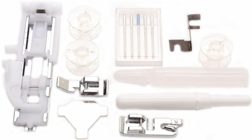 | Описание комплектации | Лапка вшивания молнии Лапка для автоматической петли Лапка подрубки края Шпульки Набор игл Вспарыватель Отвертка Масло Направитель швов |