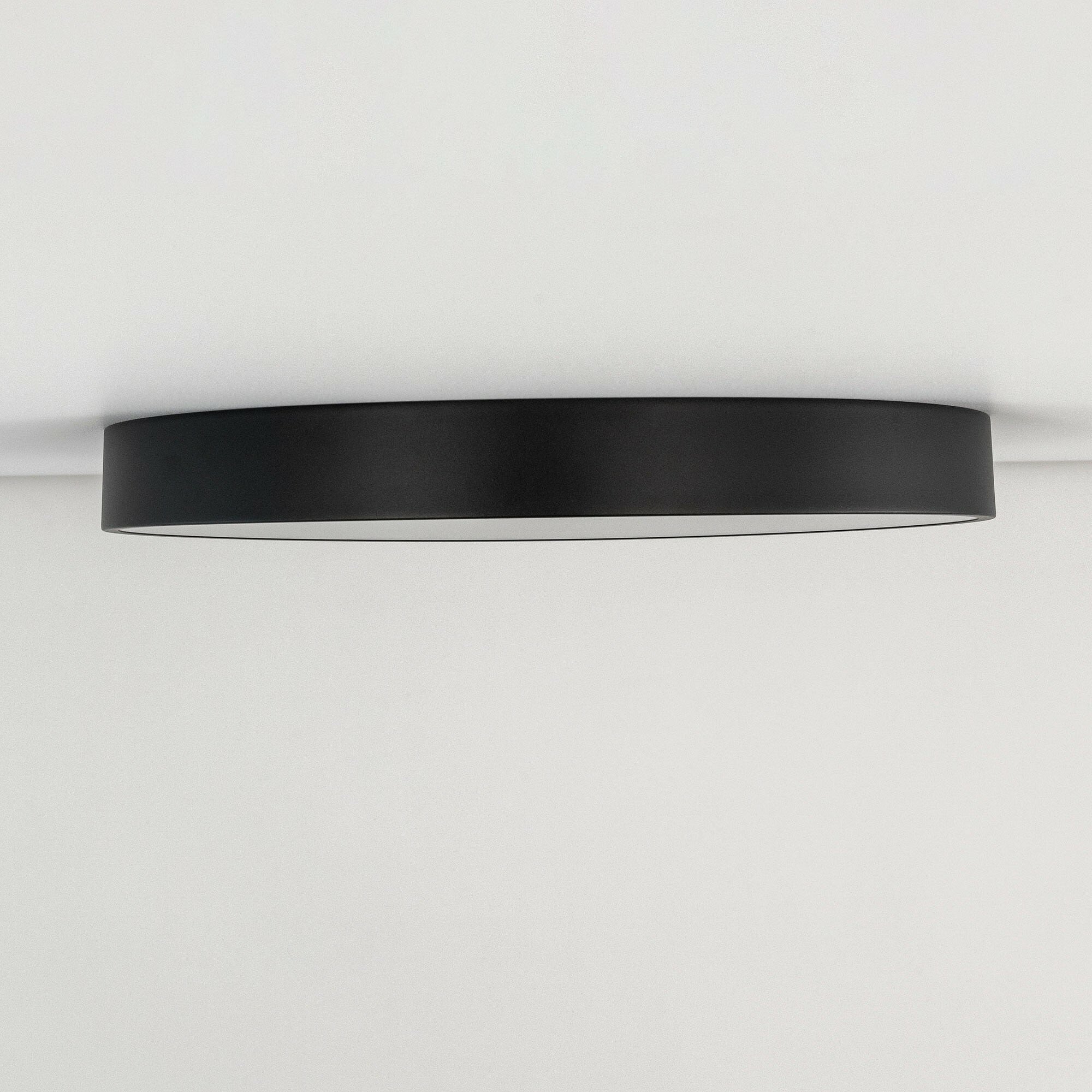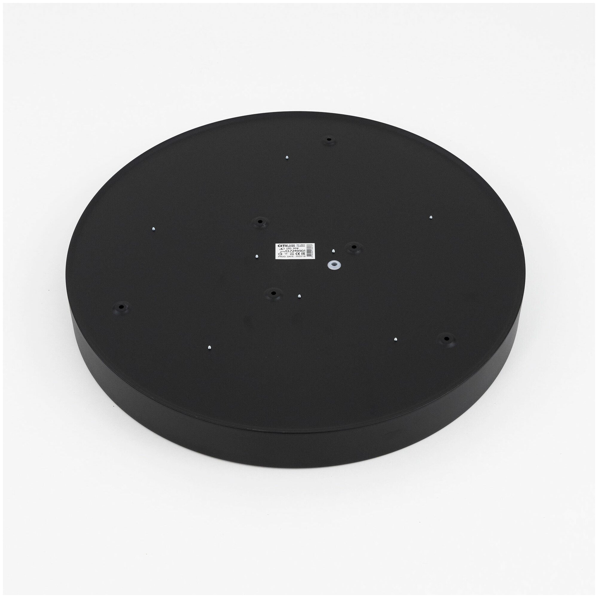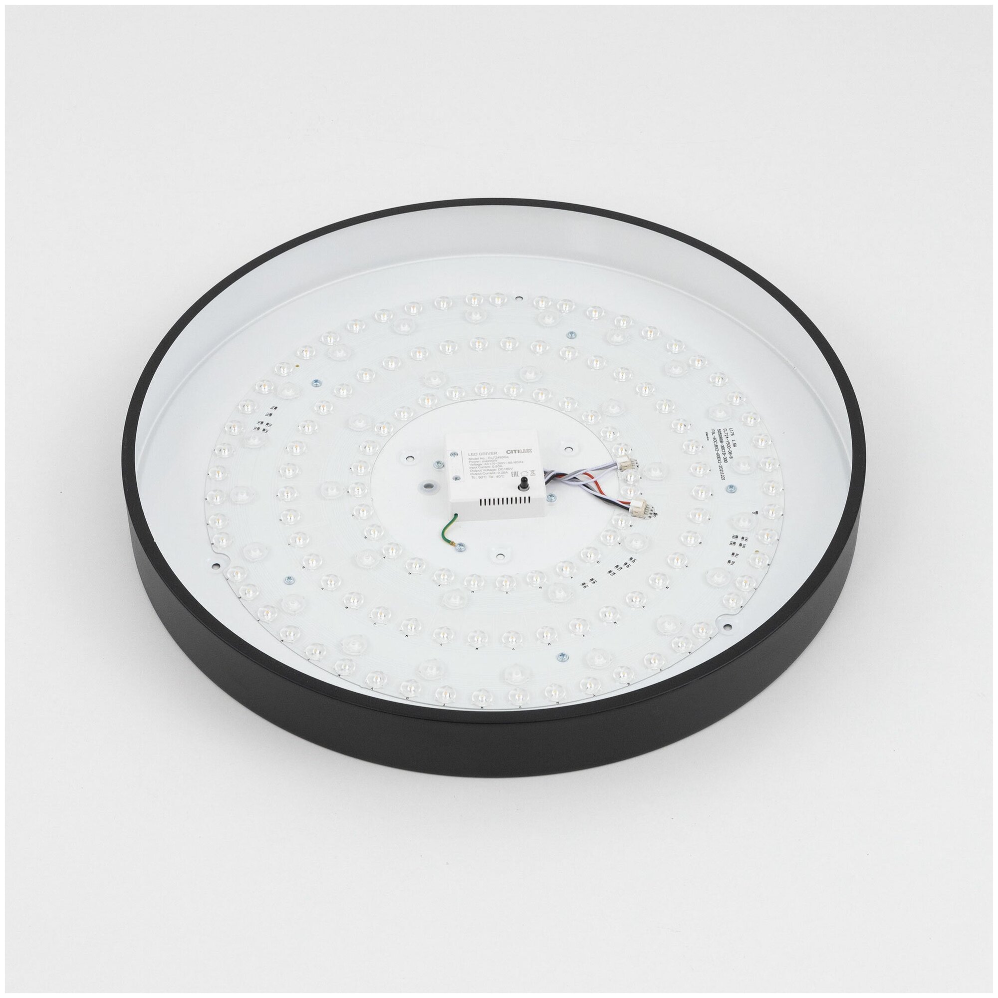 Корпус металлический, круглой формы, цвет чёрный матовый. Рассеиватель из оптического полимера. Мощность 95Вт, световой поток 7600Лм. С помощью пульта дистанционного управления доступна плавная регулировка яркости от 100 до 10%, управление цветовой температурой доступно в диапазоне от 3000К до 5500К, что позволяет настроить любые оттенки теплого, нейтрального или холодного света. Цветная RGB подсветка имеет различные режимы работы. Таймер - функция отсроченного на 20сек. выключения. Четыре кнопки памяти позволяют сохранить настроенные режимы работы и включать их пультом или обычным настенным выключателем. Подходит для всех типов потолков, в том числе натяжных. Тип крепления – через основание. Изделие комплектуется инфракрасным пультом ДУ, тип батареек ААА (батарейки в комплект не входят).