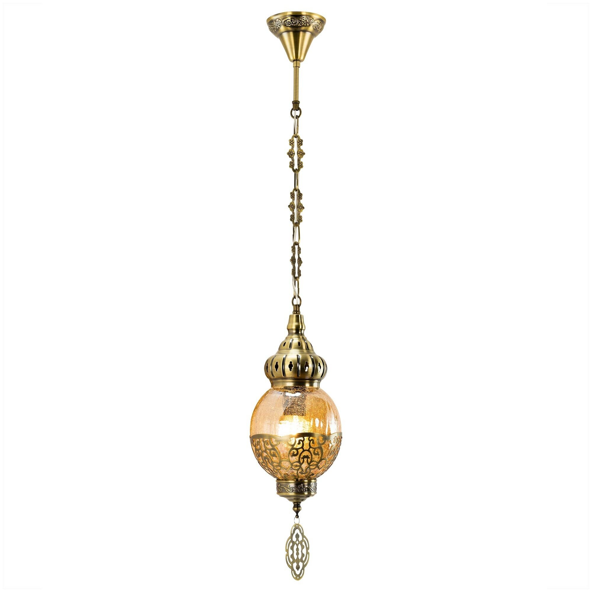 Восточный подвесной светильник Citilux Каир CL419113 с одним плафоном. Корпус металлический, цвет бронза. Плафон в форме шара, изготовлен из прозрачного стекла медового оттенка, украшен декоративными, ажурными элементами. В изделии используется лампа с цоколем Е27, максимальной мощностью для ламп накаливания 75Вт. Светодиодные лампы можно устанавливать более яркие. Модель подходит для всех типов потолков, в том числе натяжных. Тип крепления – крючок. Подвес Каир CL419113 прекрасный вариант для атмосферного освещения интерьеров квартир и загородных домов, выполненных в восточном стиле. Это великолепное решение при оформлении уютных кафе, баров и ресторанов.