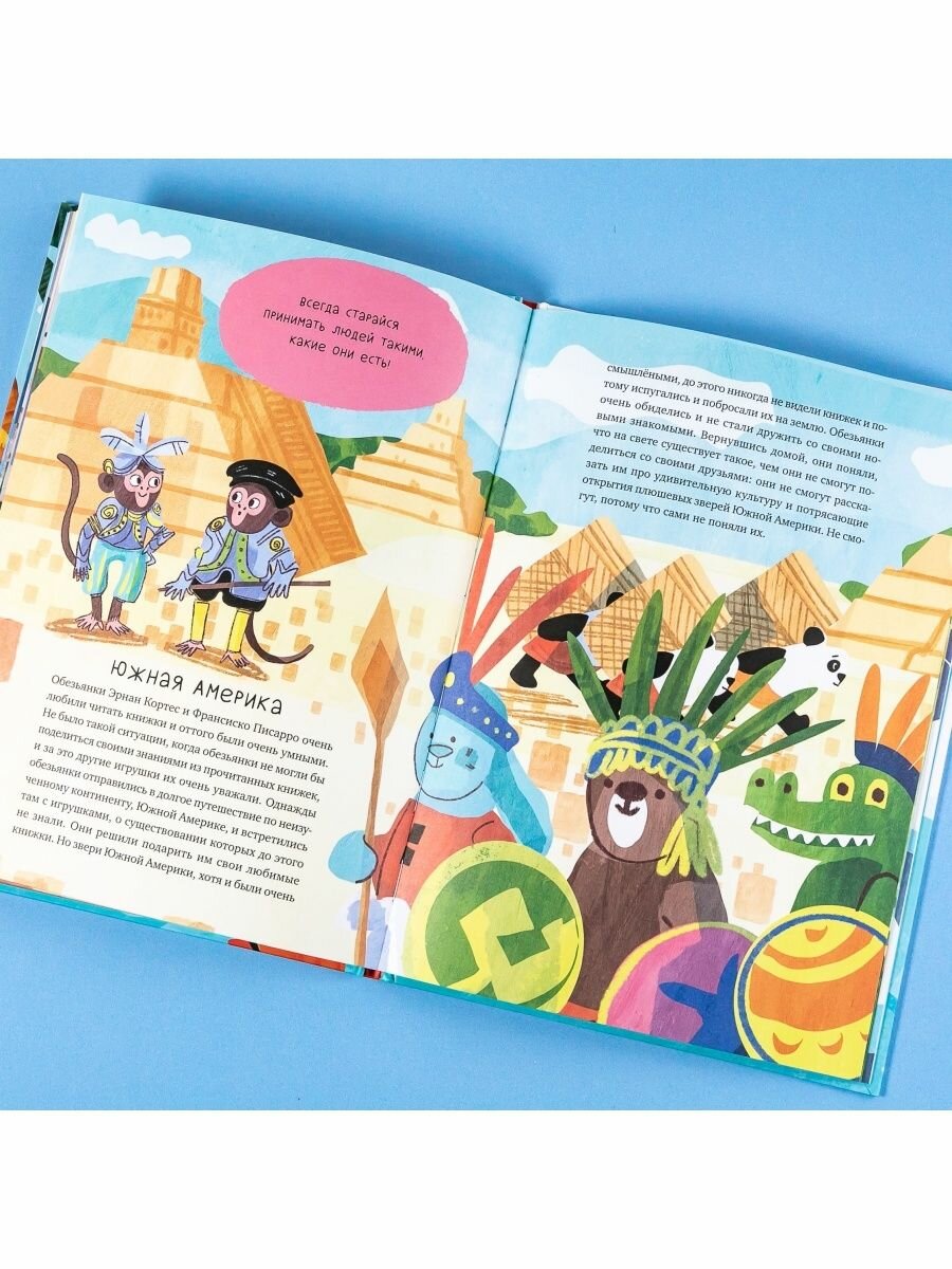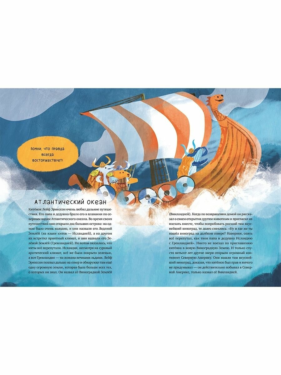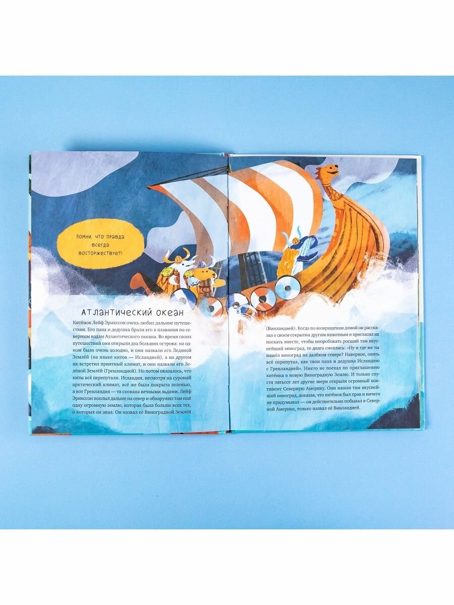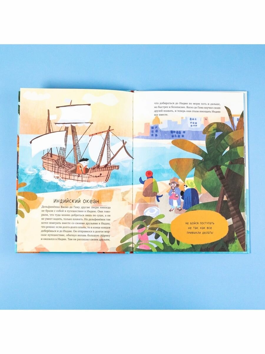 Книга просто прекрасная, для детей находка, читается легко, иллюстрации очень сочные , яркие. Сыну очень понравилась, несмотря на то, что он никогда особо не интересовался данным направлением, нам как-то всегда ближе был космос 🚀) но данное издание порадовало! Твердая обложка, тактильно приятная, листы плотные, белые, книга не маленькая, по толщине не очень толстая, о содержании скажу кратко, дабы не «спойлерить» там все от древнего мира, и путешествий Васко да Гамы, до капитана Джеймса Кука и арктики. Вообщем очень советую!