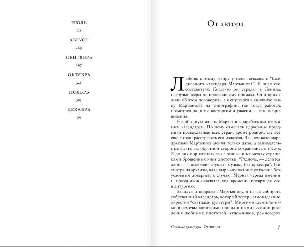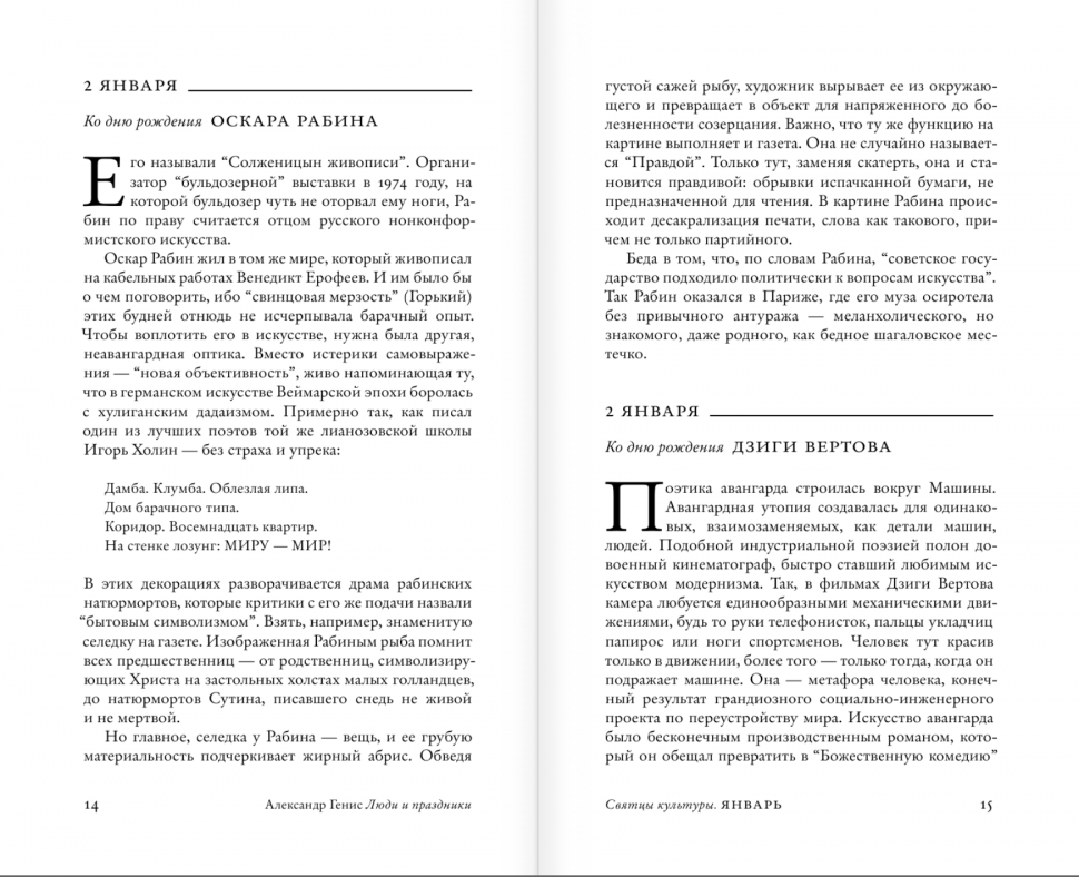 Это вступление к тому, что если вы неровно дышите к тому, что они делали в соавторстве и к написанному Вайлем, то "Люди и праздники. Святцы культуры" для вас. Сборник включает немыслимое количество (не меньше трехсот) коротеньких, совершенной формы и восхитительного содержания эссе, приуроченные к датам.
