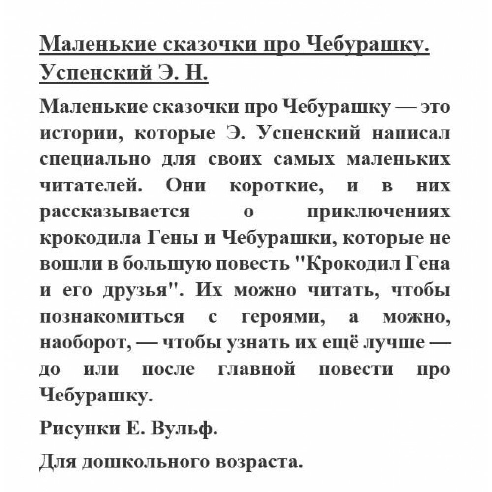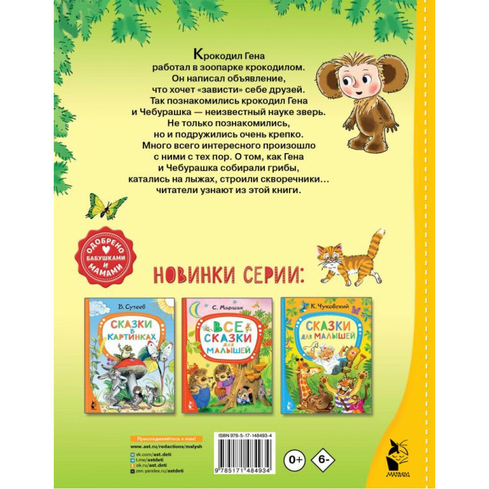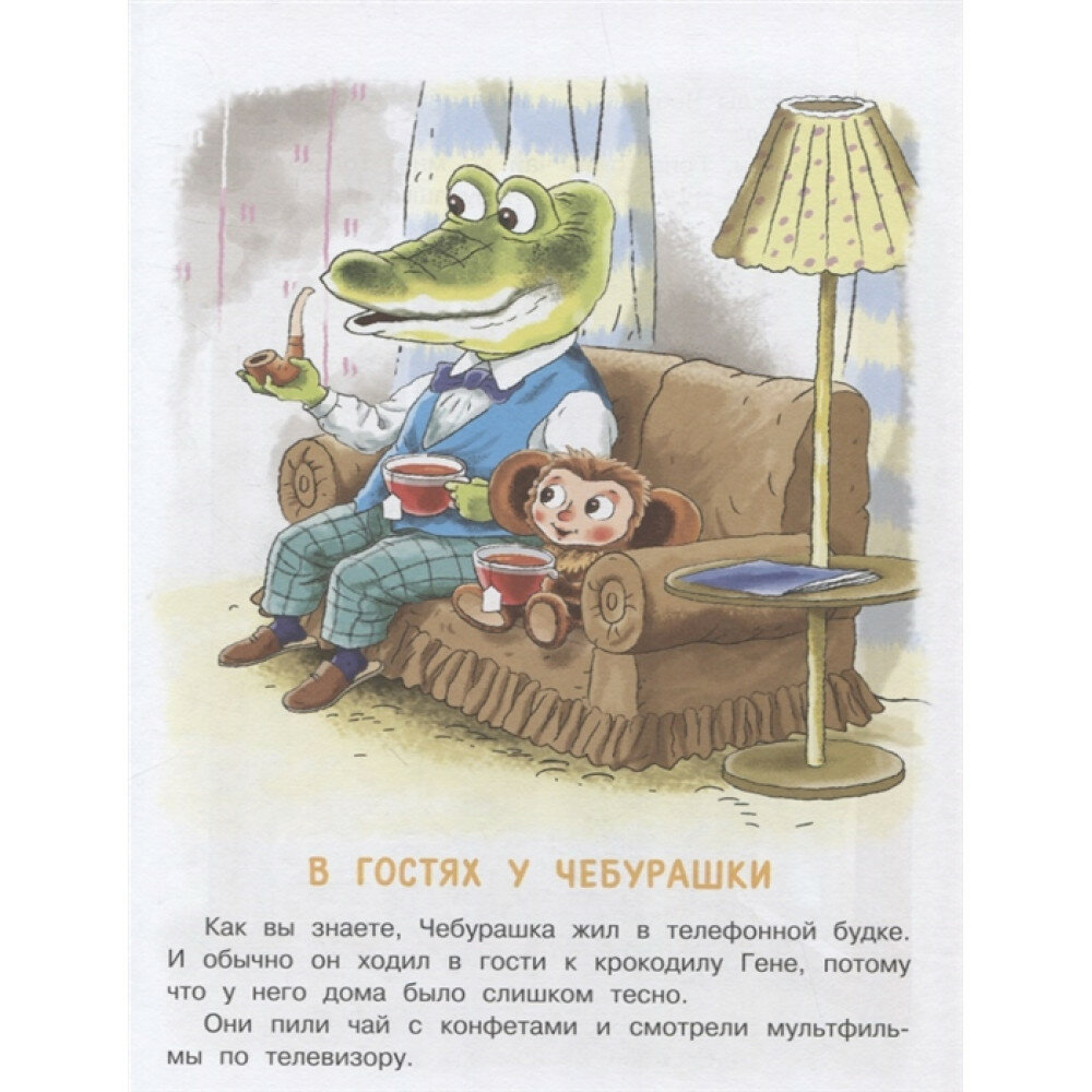 Очень милые сказки для малышей про всеми любимого Чебурашку . Я так поняла, что это альтернативные истории, которых не было в мультике. Купила своей доченьке, сейчас вместе начнем читать. А пока предварительно книжка очень красивая, приятные цвета на обложке, прям здорово!