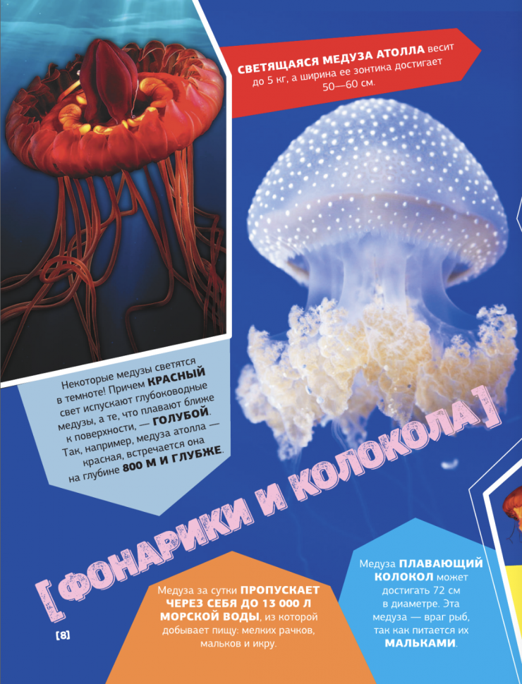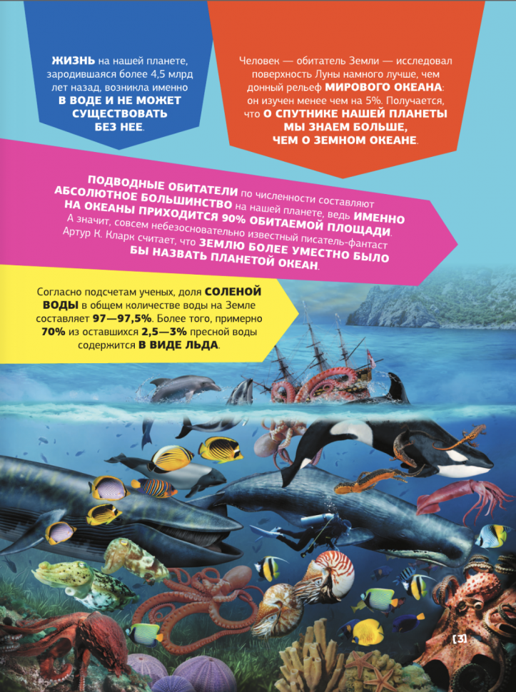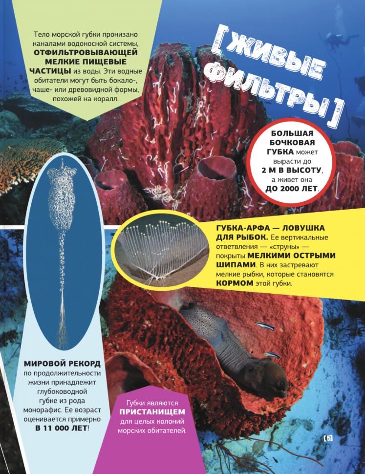 Эта энциклопедия знакомит детей с подводным миром нашей планеты, но делает это в несколько ином формате, чем другие издания. Здесь нет больших описательных статей и научной классификации - лишь короткие факты и уникальные фотографии медуз и кораллов, морских звезд и моллюсков, рыб, рептилий и водных млекопитающих. И несмотря на это, юный читатель получит полное представление о том или ином животном, ведь приведенная информация не только интересная, но и вполне познавательная, а фотоснимков так много, что удивительных обитателей морей и океанов можно рассмотреть со всех ракурсов и в мельчайших подробностях.