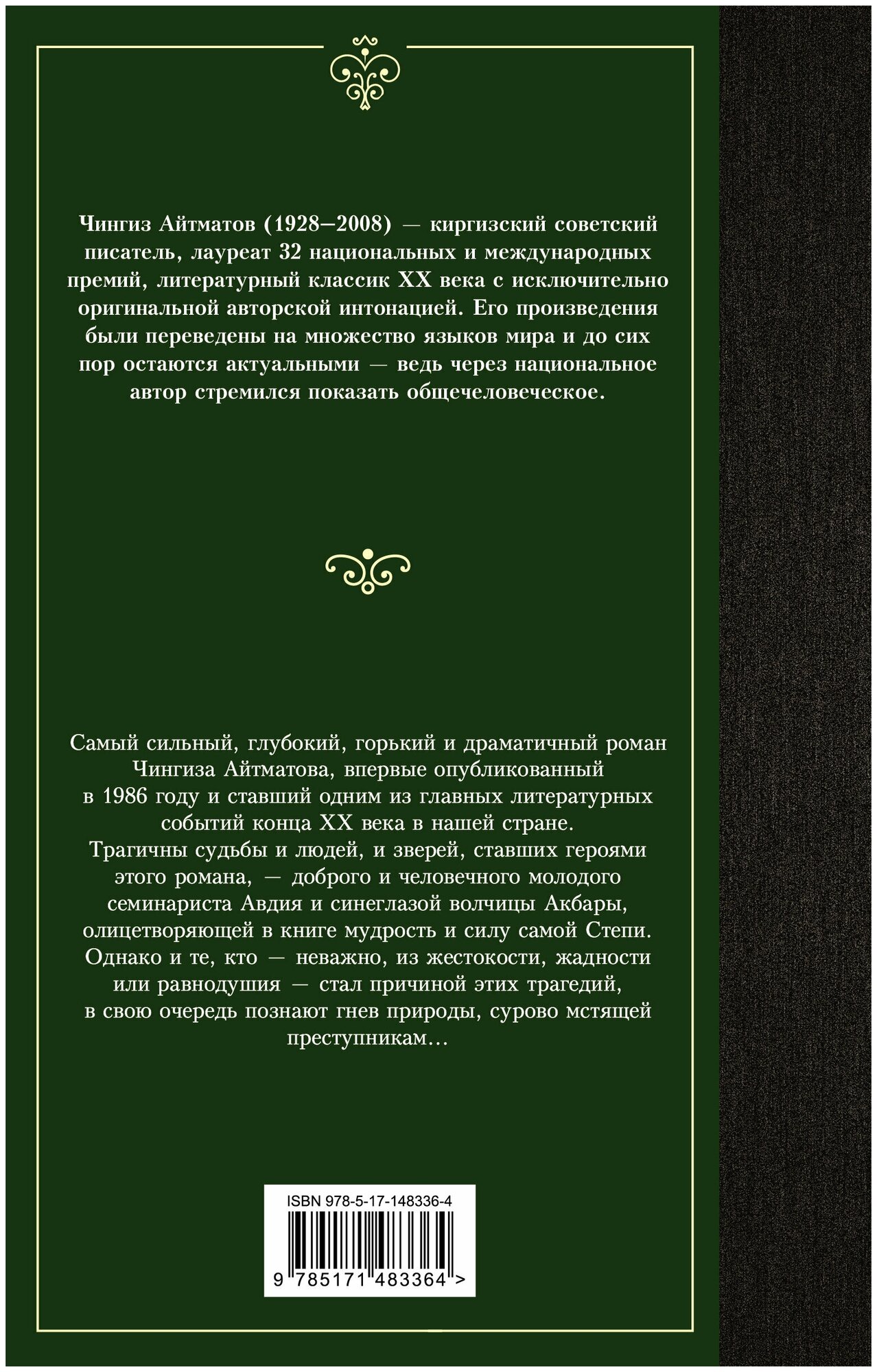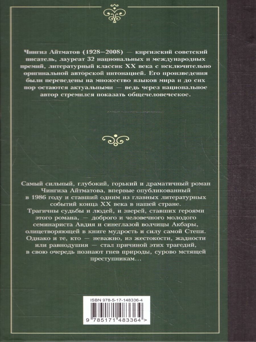 Случайно я купила эту книгу, без особых ожиданий, и поэтому испытала от её чтения огромный неожиданный восторг. Восхищает талант Айтматова простым понятным текстом писать о таких сложных глубоких вещах. До этого во многих произведениях литературы сталкивались с описанием момента распятия Христа, но читая именно это произведение я была тронута до глубины души, как будто я сама там оказалась и стала свидетелем всего этого. Это просто гениально описано. Очень рекомендую эту книгу, да она глубокая, даже тяжёлая, но она стоит того, чтобы её прочитать.