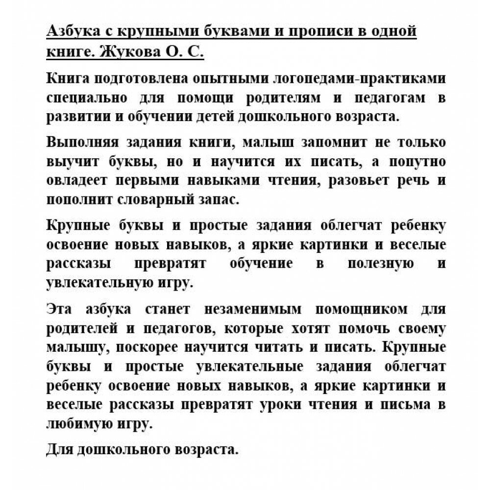 На сегодняшний день товар «Книга: Азбука с крупными буквами и прописи в одной книге (Жукова Олеся Станиславовна); ООО "Издательство Астрель", 2022» можно купить с кешбеком в 4 магазинах: book24, ЛитРес, Буквоед, Яндекс.Маркет