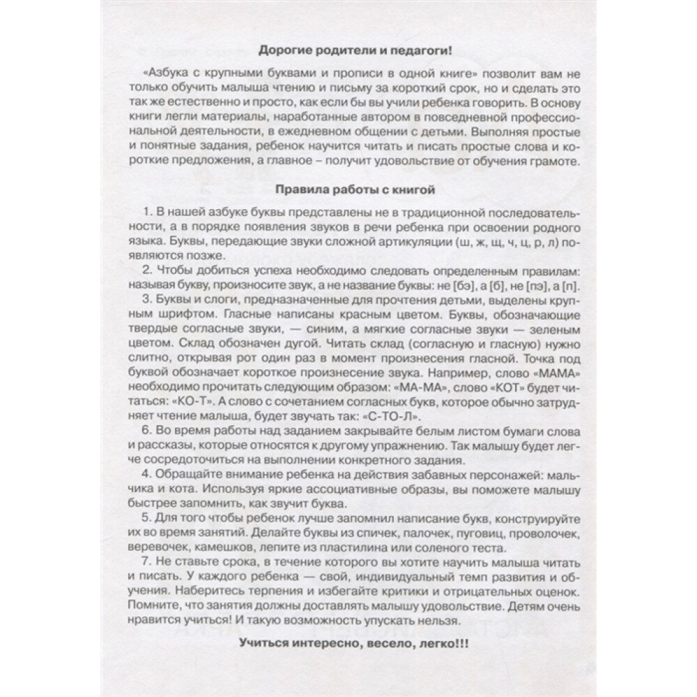 Эта азбука станет незаменимым помощником для родителей и педагогов, которые хотят помочь своему малышу поскорее научится читать и писать. Крупные буквы и простые увлекательные задания облегчат ребенку освоение новых навыков, а яркие картинки и веселые рассказы превратят уроки чтения и письма в любимую игру.