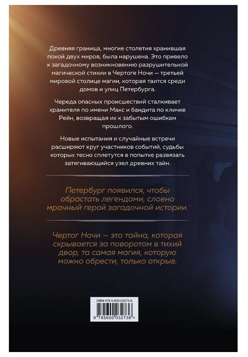 По всему Петербургу разбросаны тайные проходы. Притаившийся за ними Чертог Ночи - древняя столица магии, защищенная непроницаемым барьером. Культурные традиции разных стран переплетаются в ней друг с другом, рождая неповторимую атмосферу. Как черный бриллиант, в своей темноте этот город сохраняет силу волшебников всего мира, оставаясь невидимым для людей.