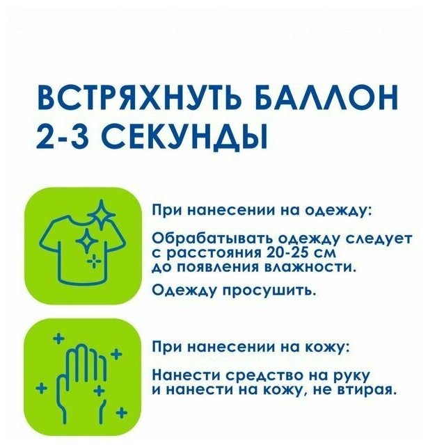Обработку одежды и других изделий из ткани проводить на открытом воздухе с расстояния 10-15 см до легкого увлажнения, держа упаковку в вытянутой руке. Располагать изделия и направлять струю средства по направлению ветра. После обработки одежду просушить.