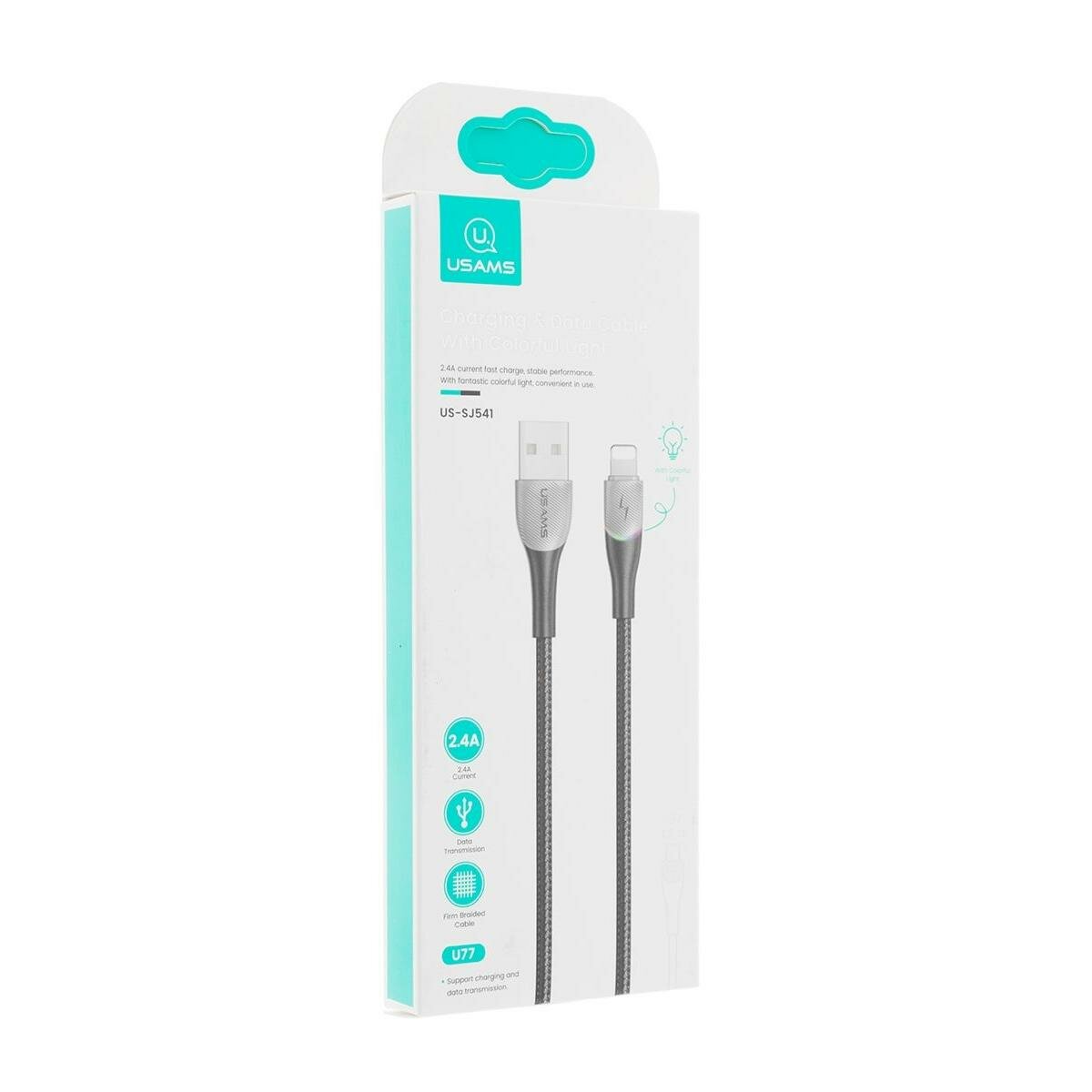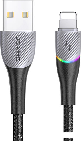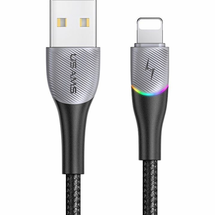 Дата-Кабель USAMS US-SJ541 U77 USB - Lightning 24А с подсветкой нейлоновая оплетка (12 m) черный (SJ541USB01) USB-Lightning, 2,4А, подсвет.нейлон.1,2 m,черный