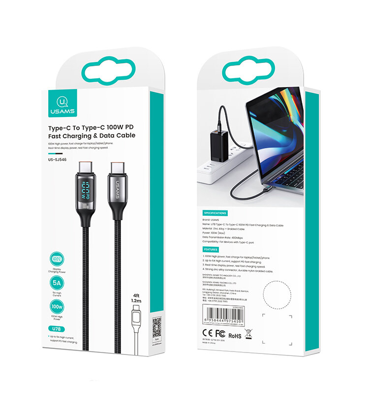 Кабель Usams US-SJ546 U78 (Type-C, 1, 2 m, Black) совместим с любыми устройствами, поддерживающими соответствующий интерфейс и функцию быстрой зарядки. Его мощность равна 100 Вт. Этот показатель отображается на встроенном в штекер цифровом дисплее. Там же транслируется значок Power Delivery при использовании данной технологии. Скорость передачи данных достигает 480 Мбит/с. Интегрированный чип автоматически устанавливает уровень напряжения, оптимальный для подсоединенного прибора. Такая опция гарантирует защиту от перегрева и перегрузок. Оплетка выполнена из нейлона - высокопрочного и износостойкого материала, предотвращающего скручивание и изломы.