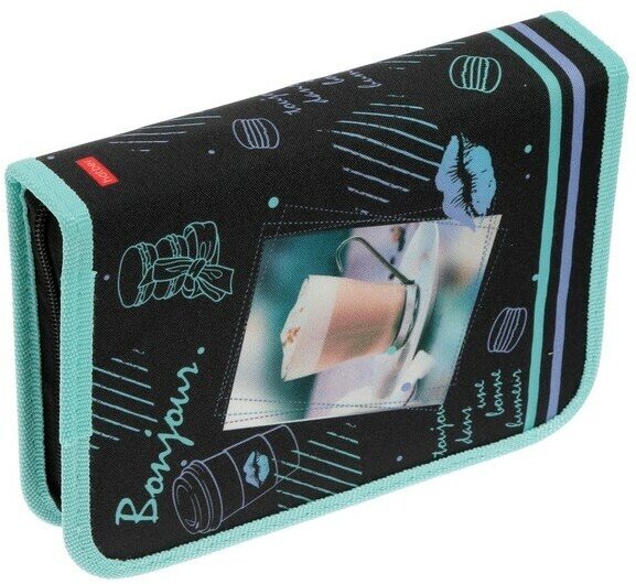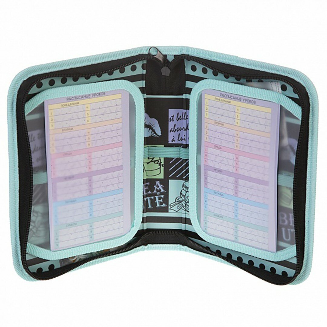 Вместительный практичный пенал для различных пишущих принадлежностей, ластика, линейки и прочих аксессуаров. На откидных планках расположены две карточки для расписания уроков, внутри полноцветный принт, соответствующий дизайну изделия.