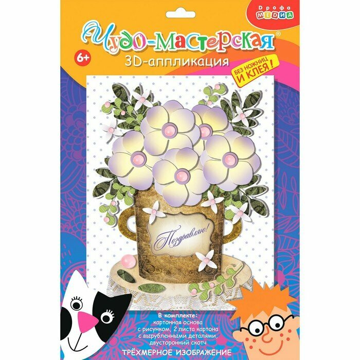 3D-аппликация – современный и очень увлекательный вид творчества. Данный набор позволит создать необыкновенно выразительную 3D-картину. Яркие и красочные детали изображения, выполненные из плотного картона, выступают над основой, создавая причудливый и сказочный мир. Этот удивительный 3D-эффект возникает благодаря использованию объёмного двустороннего скотча. Готовое изделие смотрится необыкновенно эффектно.