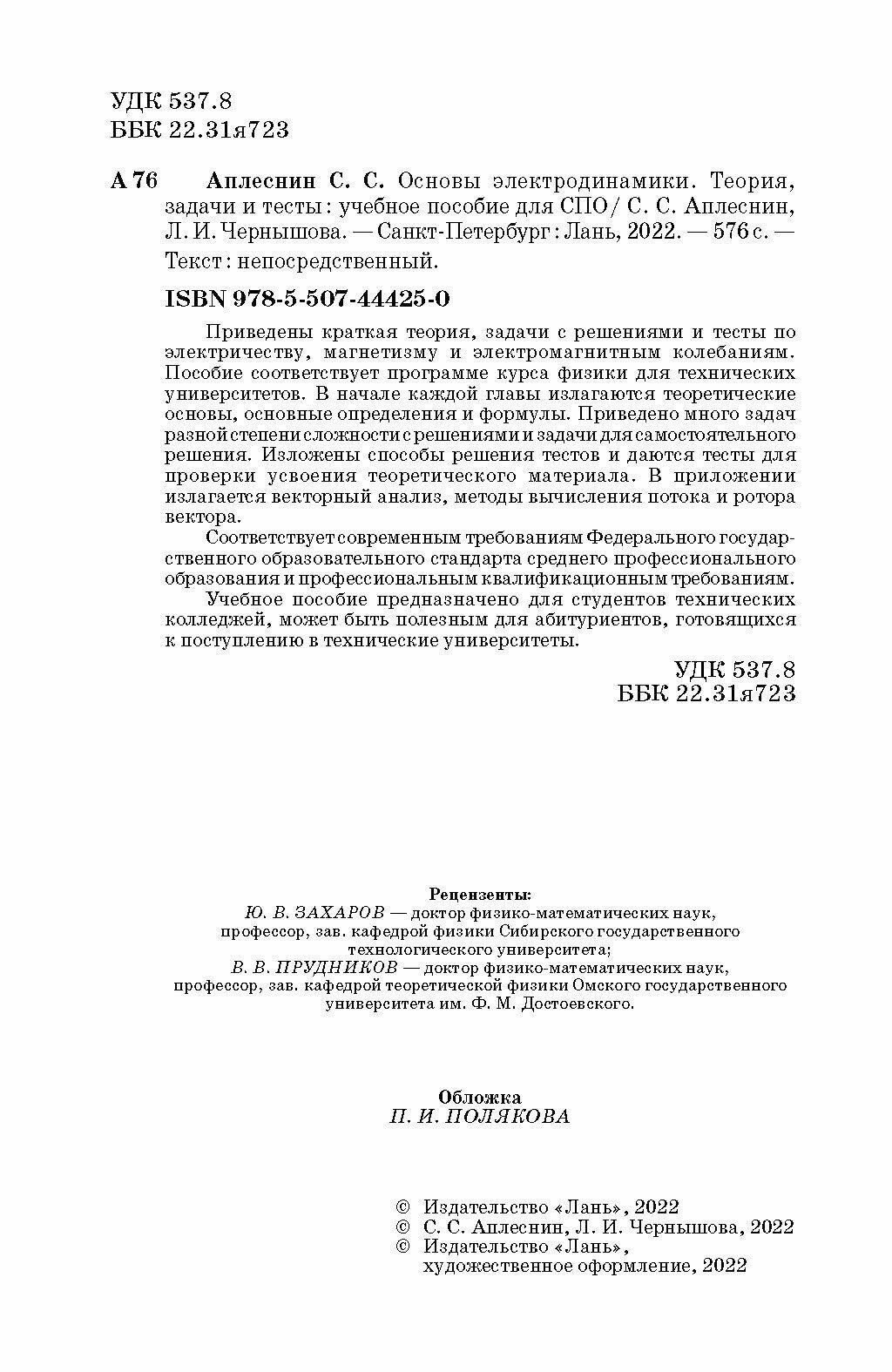 Основы электродинамики Теория задачи и тесты учебное пособие для СПО (Сергей Степанович Аплеснин, Л. И. Чернышова); Лань, 2022