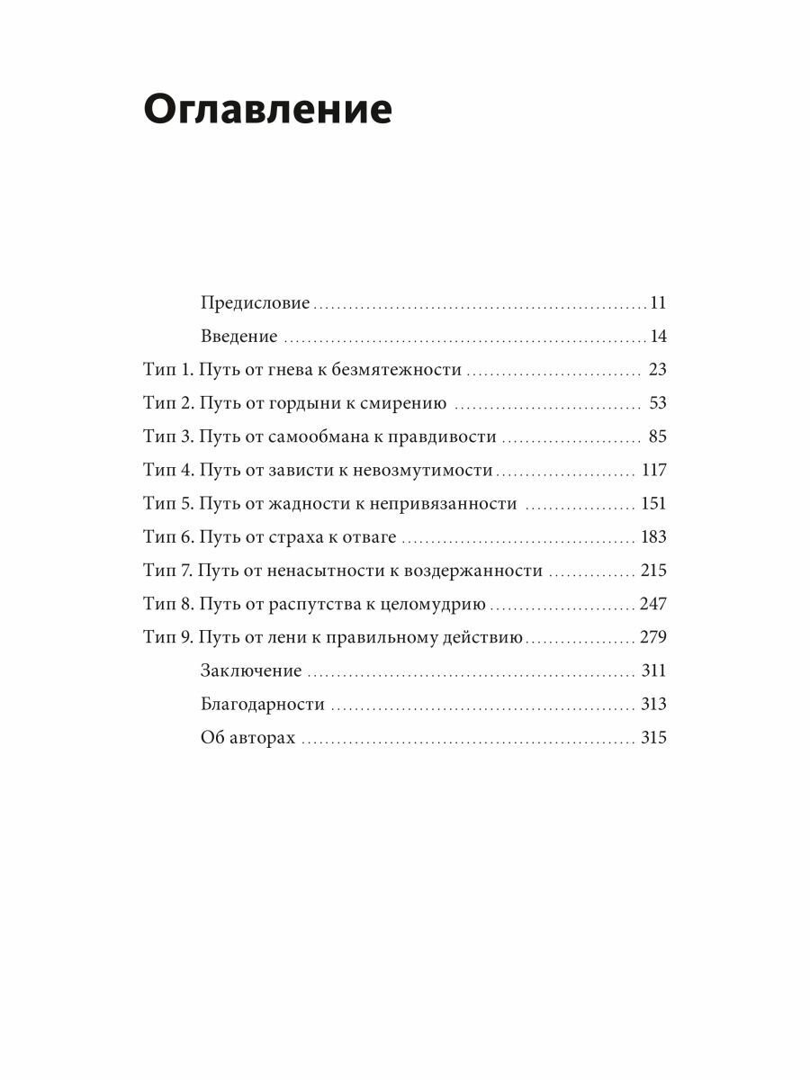Девять глав соответствуют девяти типам личности, и в каждой из них вы найдете: описание типа и основные проблемы, с которыми сталкиваются его представители, описание процесса самопознания и пути вперед.