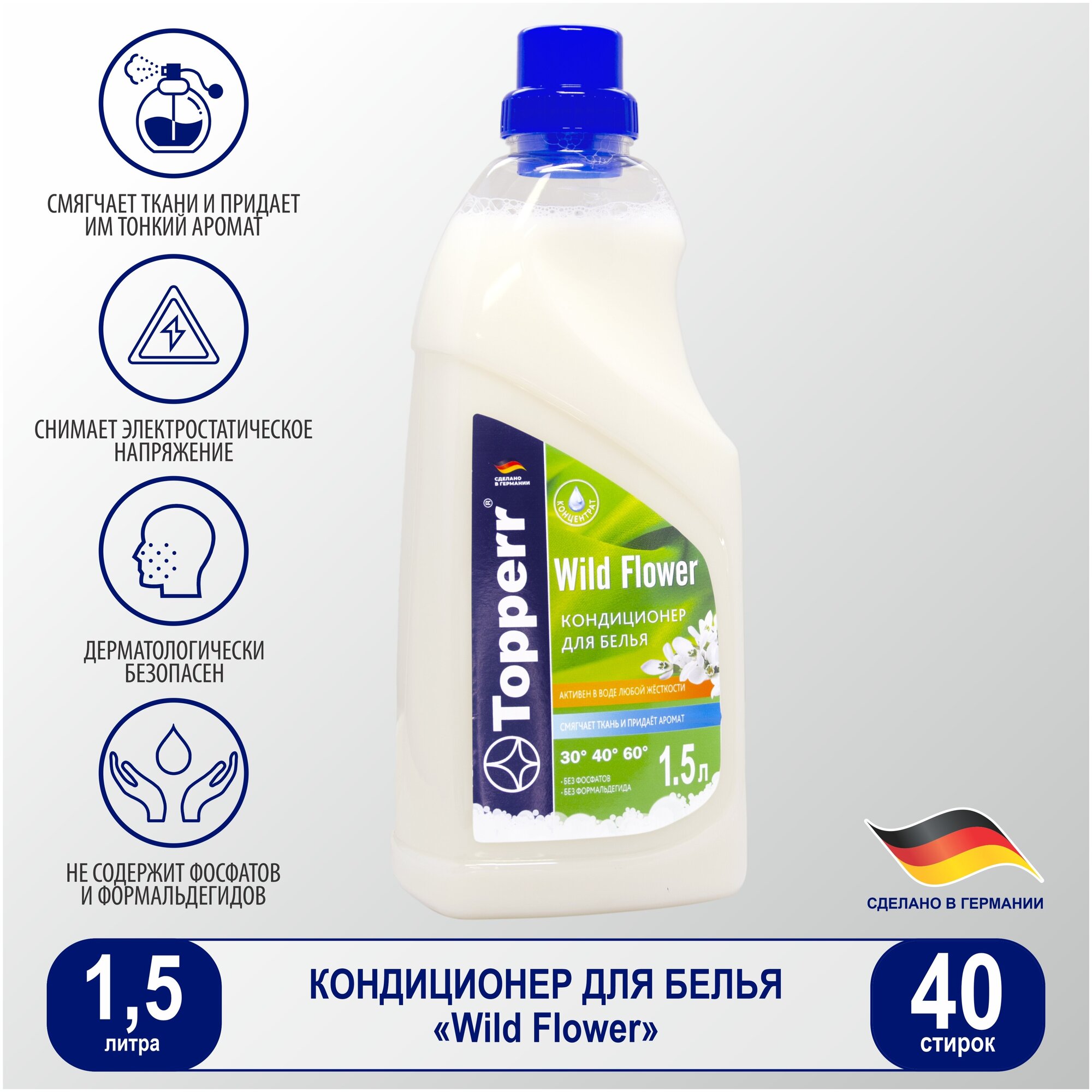 Кондиционер-ополаскиватель для белья "Wild Flower", концентрированный и высокоэффективный, бережно ухаживает за волокнами тканей, облегчает глаженье и снимает статическое напряжение.