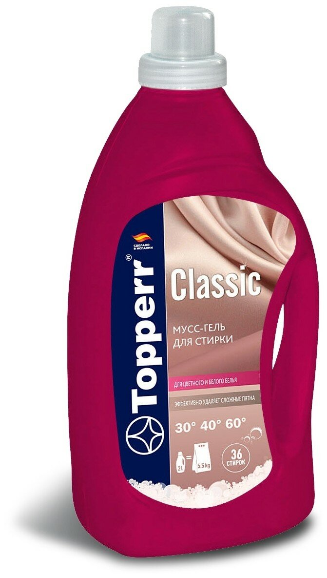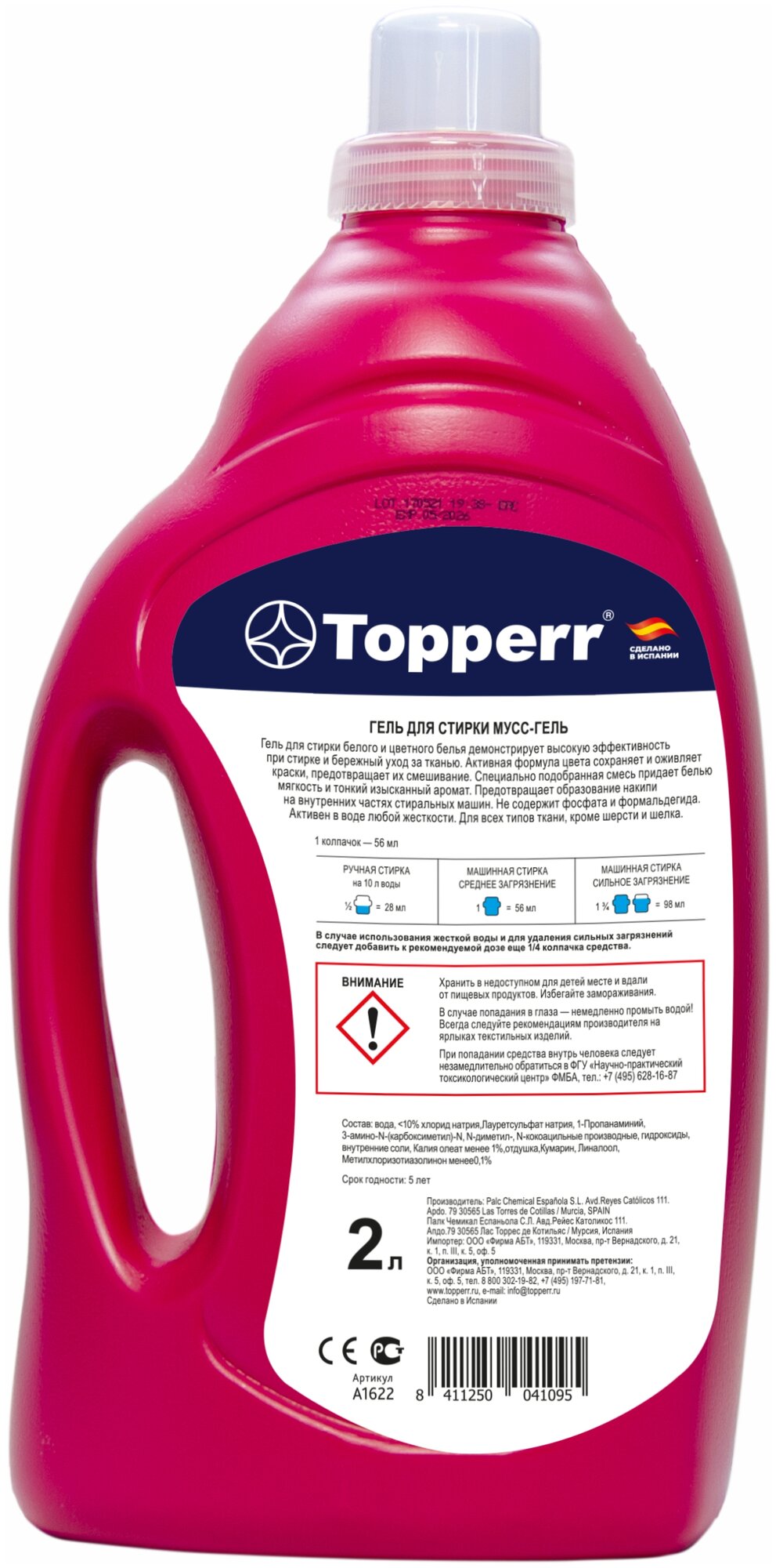 **Гель для стирки Topperr** эффективно отстирывает одежду, при этом сохраняет цвет, предупреждает появление застиранности.**Как это работает?**Концентрированное жидкое средство для стирки Topperr обладает уникальным составом. Входящие в состав добавки сохраняют интенсивность цвета, при этом гель эффективно отстирывает пятна и загрязнения. Гель для стирки концентрированный, а значит его хватит надолго! Предотвращает образование накипи на внутренних частях стиральных машин.**Жидкое средство для стирки черного белья Topperr:**- Произведено в Испании.- Сохраняет интенсивность и глубину красок черных и темных тканей.- Не содержит фосфата и формальдегида.- Активно в воде любой жесткости.- Для всех типов ткани, кроме шерсти и шелка.- Экономичная упаковка - объем 2 литра.