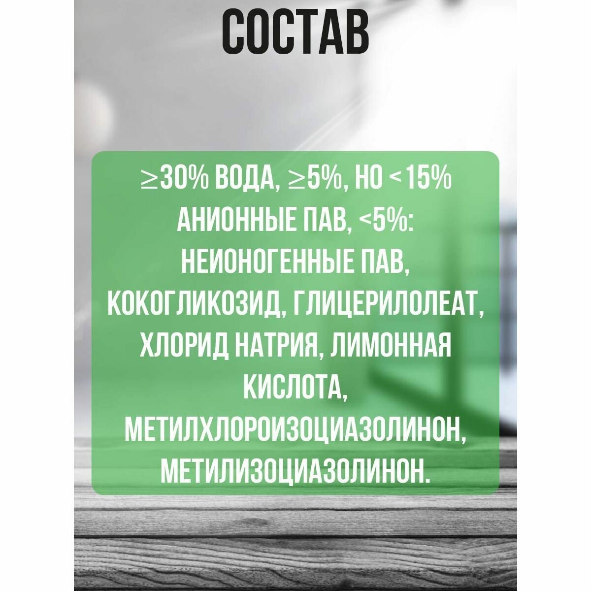 | Состав | деионизированная вода, неионогенные ПАВ (более 5%, но менее 15%), анионные ПАВ (менее 5%), регулятор кислотности, регулятор вязкости, консервант (не менее 0,2%), отдушка, краситель. |