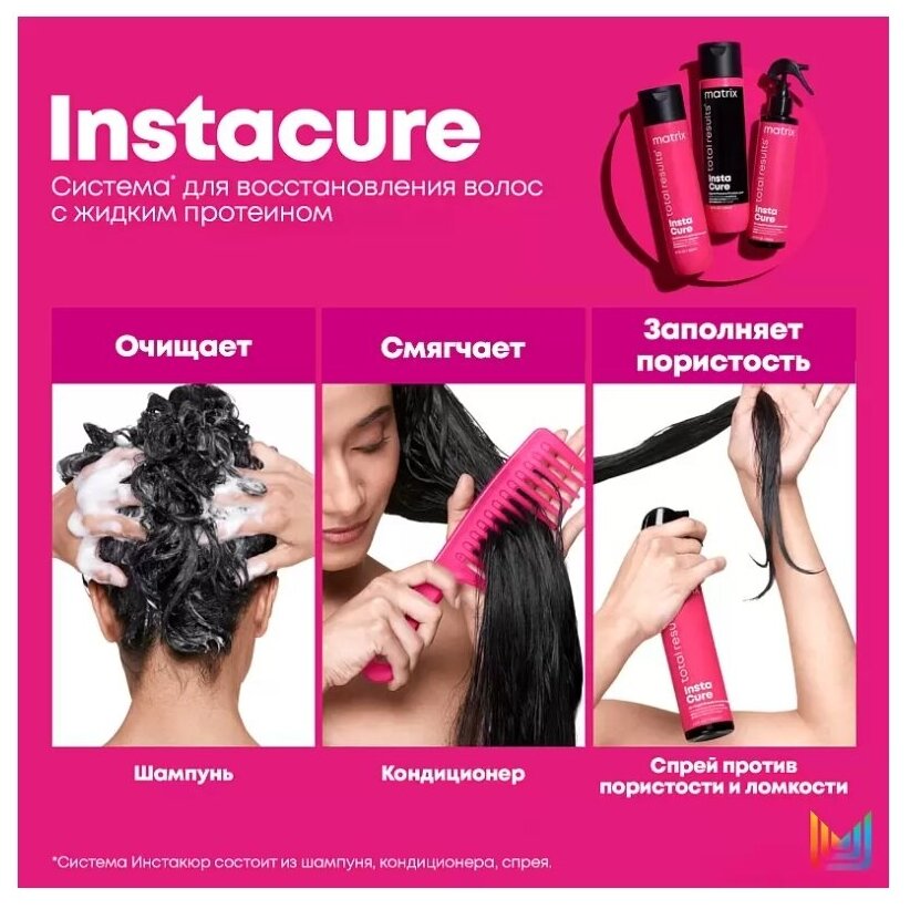 Кондиционер Instacure против ломкости, обогащенный жидким протеином, помогает восстановить силу, уменьшить ломкость сухих и поврежденных волос. Система из шампуня, кондиционера, спрея против ломкости и пористости заполняет пористость, создавая ровную и гладкую поверхность волоса.