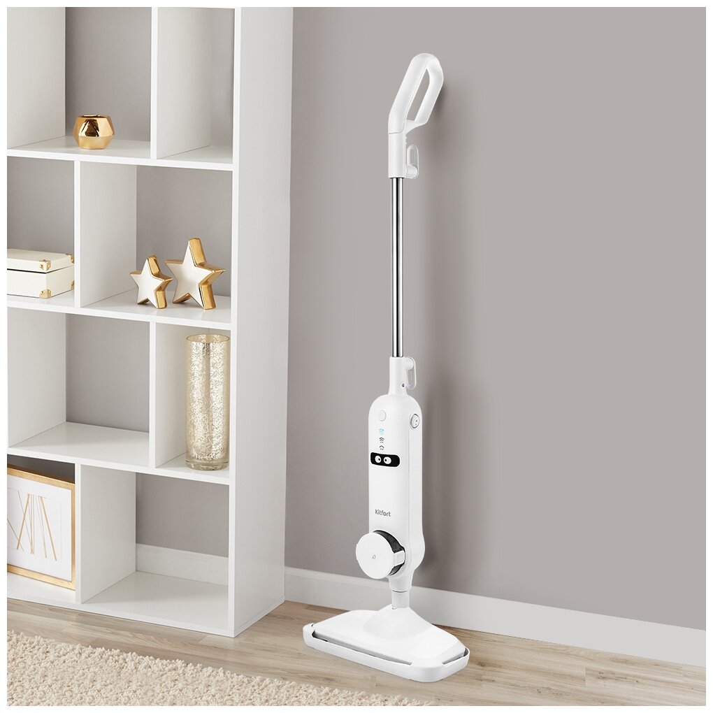 | Дополнительно * | Паровая швабра КТ-1015 с функцией вертикальной парковки - универсальное устройство, которое поможет избавиться от пыли и грязи с помощью мощной струи пара, а также продезинфицирует обрабатываемую поверхность. Время нагрева всего 15-30 секунд., Кнопка переключения уровня выбрасываемого пара позволяет настраивать интенсивность работы устройства. Это очень удобно при очистке разных типов поверхностей с разным уровнем загрязнения., Пар проникает внутрь загрязнения, размягчая и растворяя его, а затем с помощью тряпки большой площади частички грязи смываются. Тряпка надёжно крепится на липучках. Её можно стирать в стиральной машине при 60 °С., Помимо гладких поверхностей, паровая швабра также убирает ковровые покрытия с недлинным ворсом. Чтобы тряпка не цеплялась за ковёр, комплектацией швабры предусмотрена рамка, которая крепится на щётку и тряпку., Напольная щётка закреплена на специальном шаровом шарнире с наклоном в двух плоскостях, что делает швабру очень маневренной и облегчает уборку., Паровая швабра обладает функцией вертикальной парковки и большим углом наклона при уборке, который поможет легко убирать пространство под мебелью., Резервуар у паровой швабры съёмный. В нём предусмотрен фильтр для очистки воды во избежание образования накипи в бойлере и разводов на полу., Швабра лёгкая и простая в использовании. При хранении она не займёт много места. Шнур длиной 5 м не сковывает и не ограничивает ваше перемещение во время уборки. На ручке и корпусе швабры имеются держатели для смотки шнура., Наша техника порадует вас не только своим функционалом, но и интересным дизайном! В любой момент вы можете отклеить креативный стикер без вреда для поверхности. |