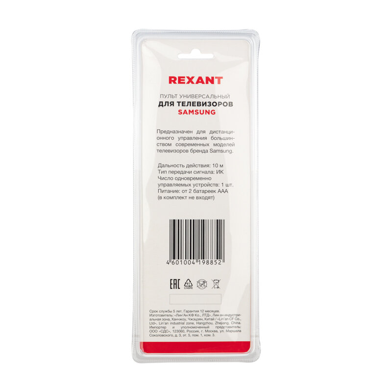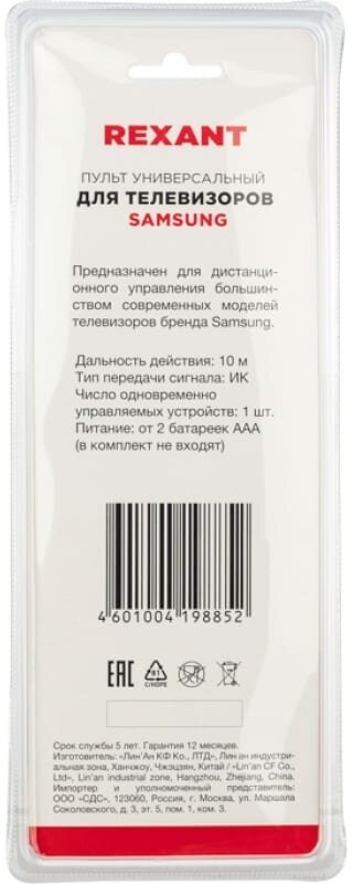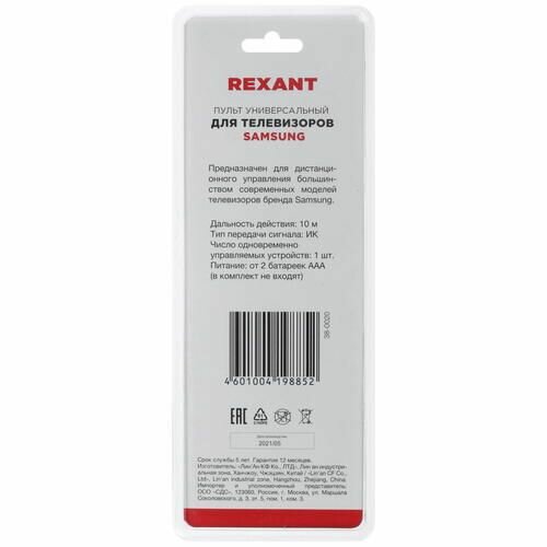 Универсальный пульт дистанционного управления Rexant для телевизора Samsung. Пульт поддерживает все необходимые функции, обеспечивающие максимально полное и удобное управление телевизором. Имеет низкое энергопотребление, удобен и прост в настройке.