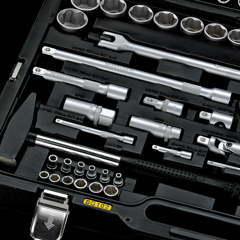 Набор из 102 предметов, включающий в себя гаечные ключи, отвертки и торцевые головы. Все элементы выполнены из высокопрочной стали с покрытием, защищающим от коррозии. Для хранения и транспортировки в комплектацию входит кейс, внутри которого производится надежная фиксация всех включенных инструментов.