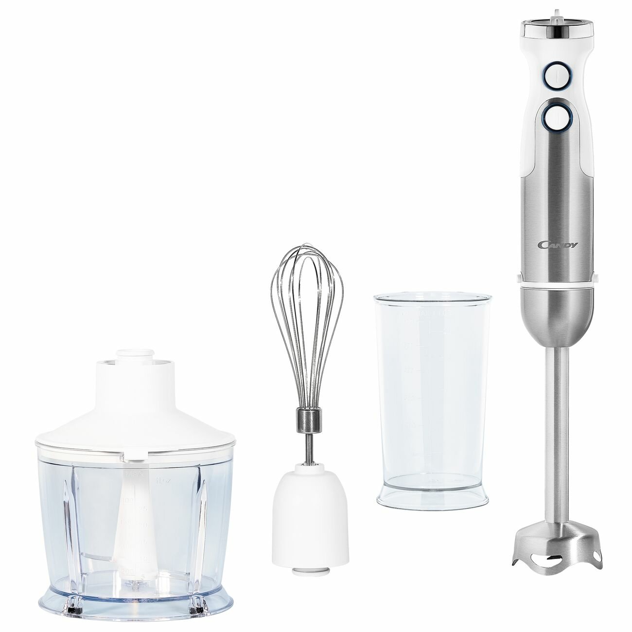 Погружной блендер Candy работает от бытовой электрической сети с напряжением питания 220 В. Показатель потребляемой мощности мотора не превышает 1200 Вт. Длина кабеля питания равна 1 м. Встроена кнопка включения и выбора режима «Турбо». Доступно шесть уровней регулировки скорости. Основная часть корпуса устройства выполнена из пластика, съемные элементы и ножи сделаны из металла, устойчивого к образованию коррозии. В комплект входит мерный стакан емкостью 600 мл. Погружную часть можно мыть в посудомоечной машине. Вес блендера составляет 1,8 кг.