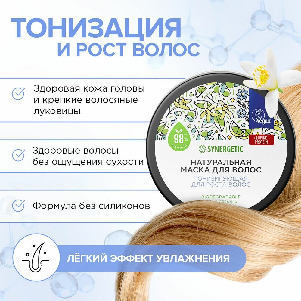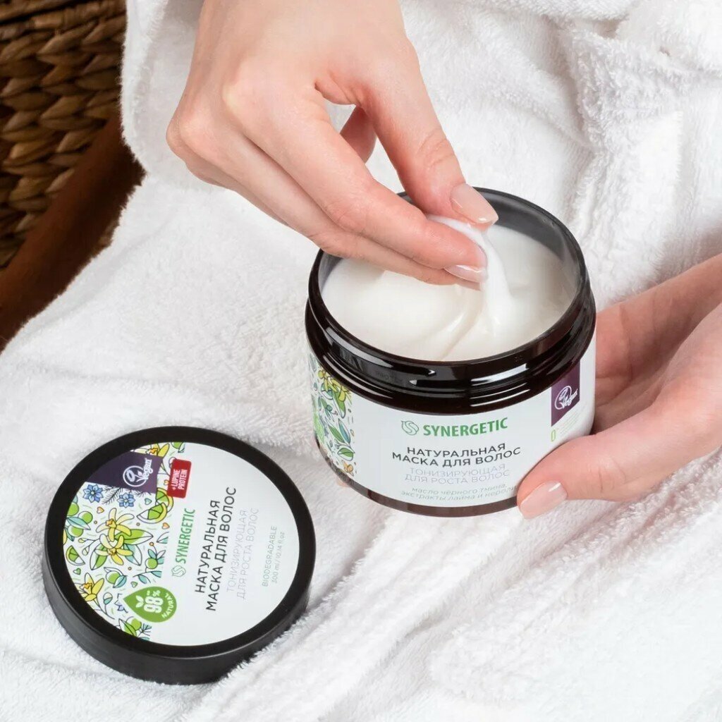 Натуральная маска Synergetic "Тонизирующая для роста волос" воздействует на волосы и кожу головы и эффективно решает проблему преждевременного выпадения волос, укрепляя и «пробуждая» волосяные луковицы.