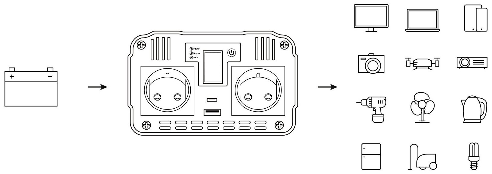 Современный импульсный преобразователь эффективно преобразует постоянный ток в диапазоне от 10.5V до 15.8V в переменный 220V с модифицированным синусом (MSW). имеет постоянную мощность 1200W, пиковая мощность достигает 2400W, чего хватит для питания портативной техники и небольших бытовых приборов вдали от электросети, например, телевизор, проектор, моноблок, ноутбук, игровая консоль, принтер, блендер, кофемолка, электрическая бритва, плойка, фен, электроинструмент и другая техника.