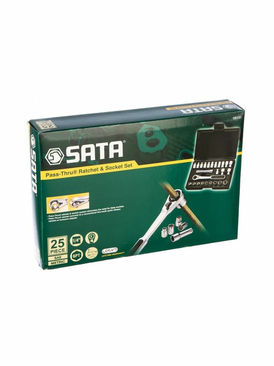 25PC. 14 DR. SOCKET SET (METRIC S.A.E.) Набор для работы со шпильками. Метрические полые головки: 19, 20, 21, 22, 24, 27, 30, 32, 34 мм. Головки дюймовые: 532, 316, 732, 14, 932, 516, 38, 716, 12. Переходник на автомобильные головки 12. Удлинитель полый 6. Ключ реверсивный трещоточный для полых головок. Преимуществом любого набора марки SATA является то, что любую его составляющую вы можете приобрести отдельно.