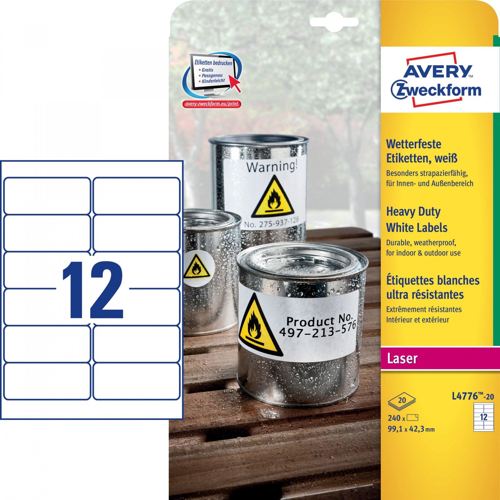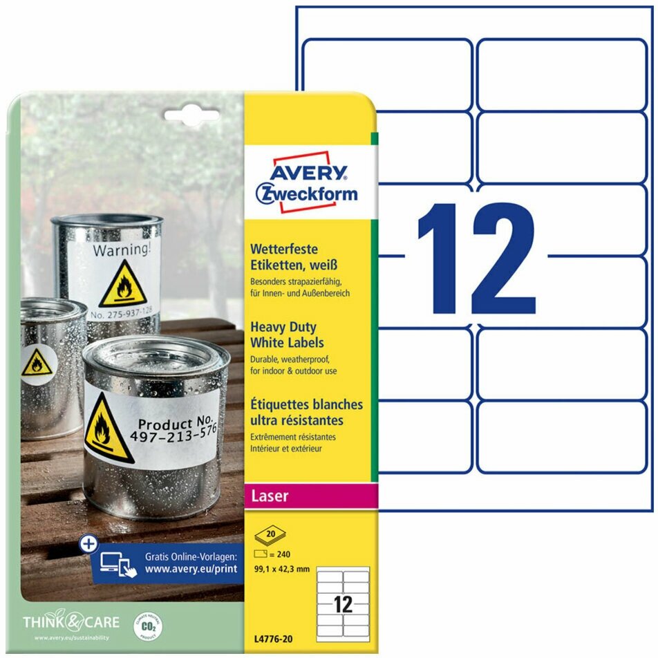 самоклеящиеся этикетки Avery Zweckform 991х423 мм белые всепогодн. высокопрочн. перманентн. 20л 240шт L4776-20