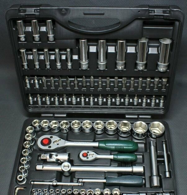 | Комплектация | торцевые головки, биты, трещотки, удлинители, вороток, отвертки, ключи |