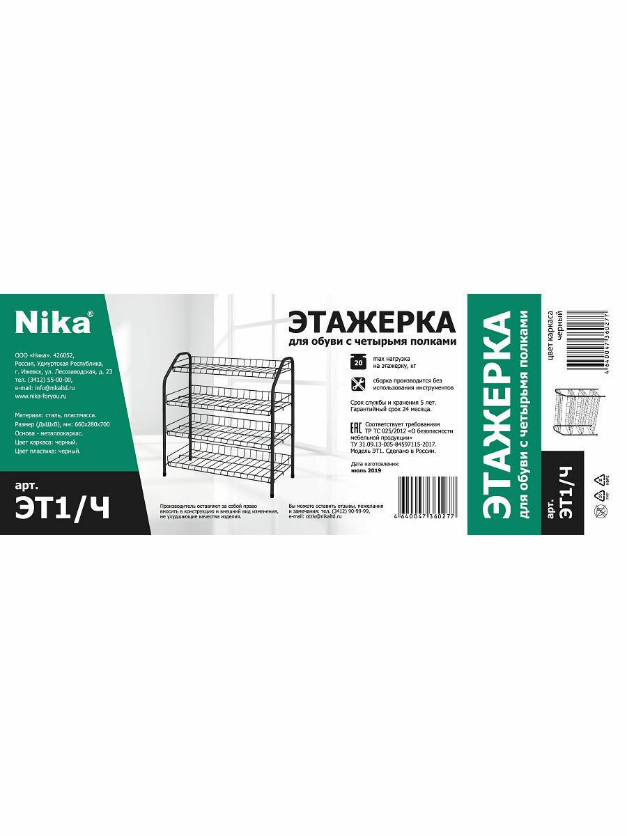 | Прочие особенности | Этажерка для обуви 4 полки NIKA,,Преимущества:,,-4 полки для размещения обуви,,-металлический каркас,,-покрытие каркаса этажерки устойчиво к механическим воздействиям,,-пластиковые колпачки на ножках защищают поверхность пола от царапин,,-допустимая нагрузка не более 20кг,,-конструкция этажерки разборная |