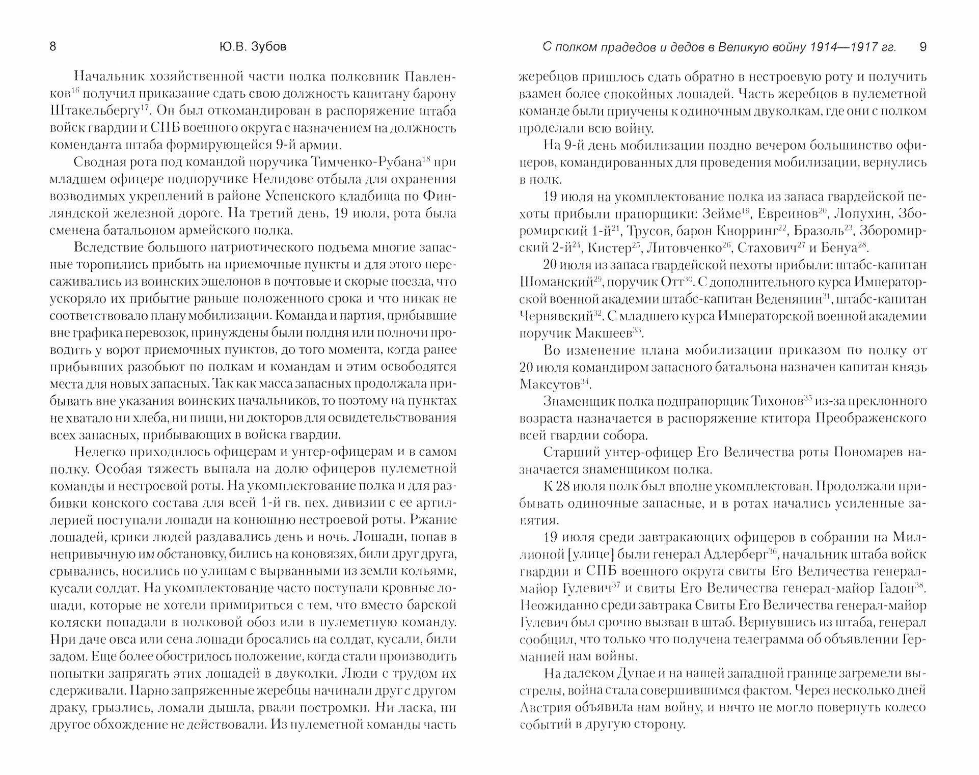 Материал Зубова состоит из нескольких частей: 100 с небольшим стр. посвящено выступлению в поход и участию в боевых действиях 1914 г., 230 стр. уделено кампании 1915 г., 1916 и 1917 гг. в истории преображенцев описаны, соответственно, на 45 и 60 стр.