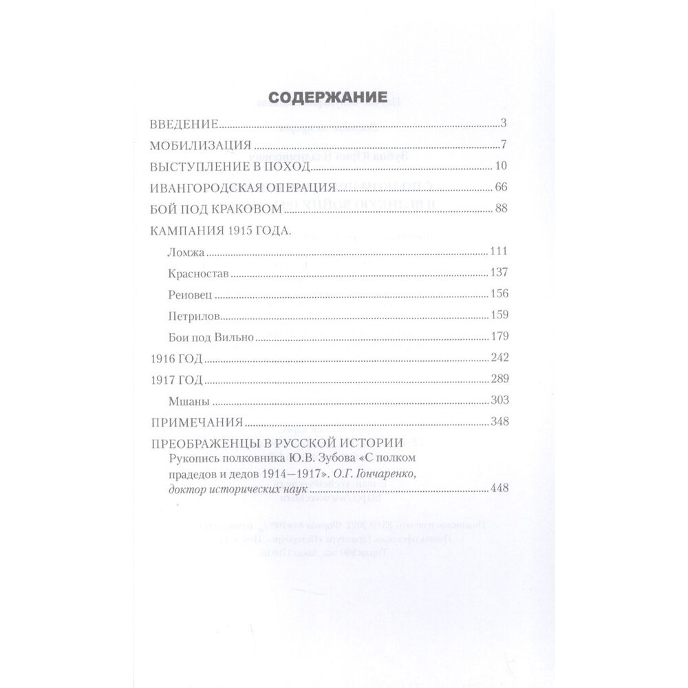 Книга полковника Лейб-гвардии Преображенского полка Юрия Владимировича Зубова рассказывает об участии старейшего полка Русской армии в Первой мировой войне. Автор достоверно отображает бои преображенцев в Галицийской битве (август-сентябрь 1914 г.), Варшавско-Ивангородской операции (на р. Висле в сентябре-октябре 1914 г.), Виленском сражении (август-сентябрь 1915 г.), Луцком прорыве (июнь-август 1916 г.).