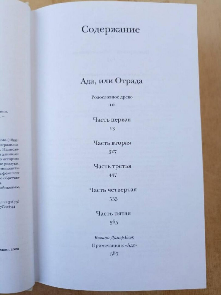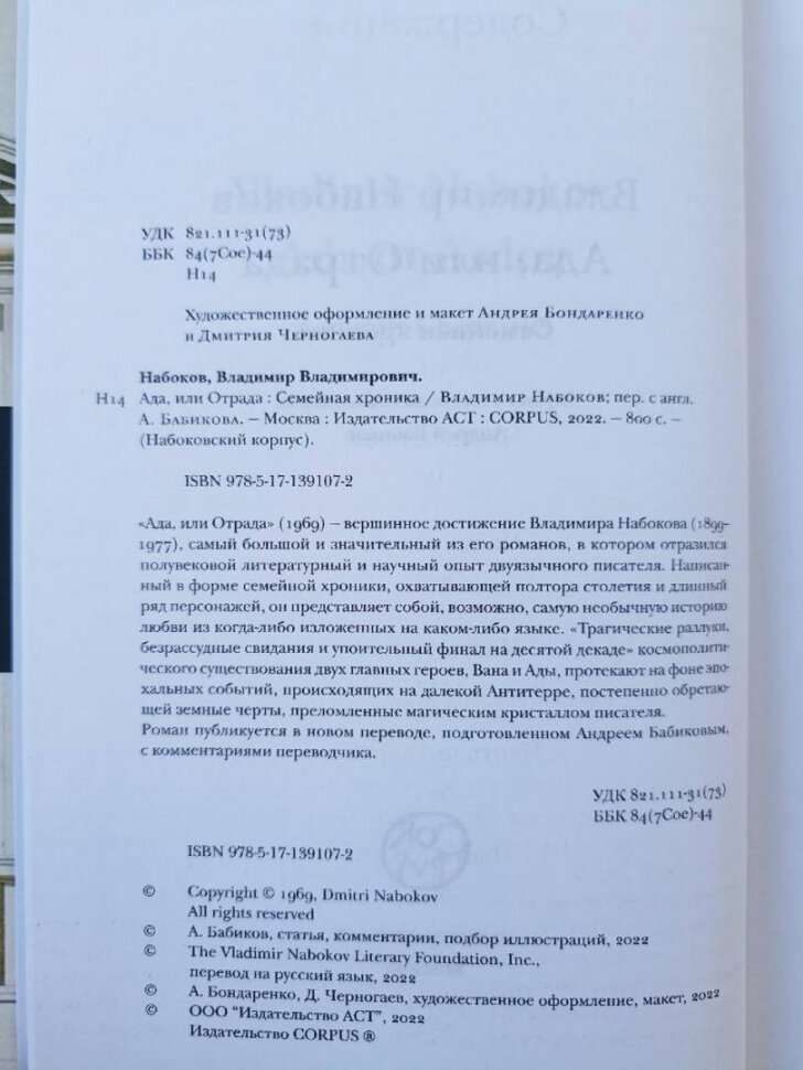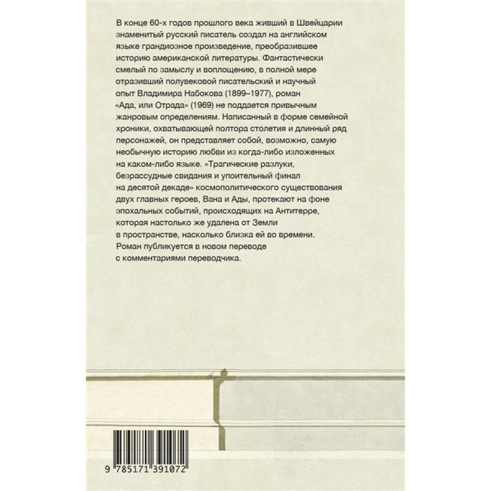 Перевод этого издания , на мой взгляд ,литературно жалок по сравнению с переводом изданным в 1994 году и вошедшим в дополнительный " 5 " том к уже изданному первому сс Набокова в 4-х томах...поэтому, покупателям романа " Ада ", прошу отнестись к покупке этой книги с осторожностью....