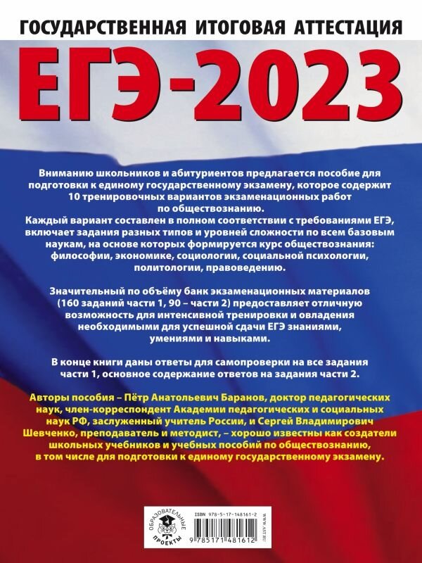 ЕГЭ-2023. Обществознание (60x84/8). 10 тренировочных вариантов экзаменационных работ для подготовки к единому государственному экзамену (Баранов Петр Анатольевич, Шевченко Сергей Владимирович); АСТ, 2022