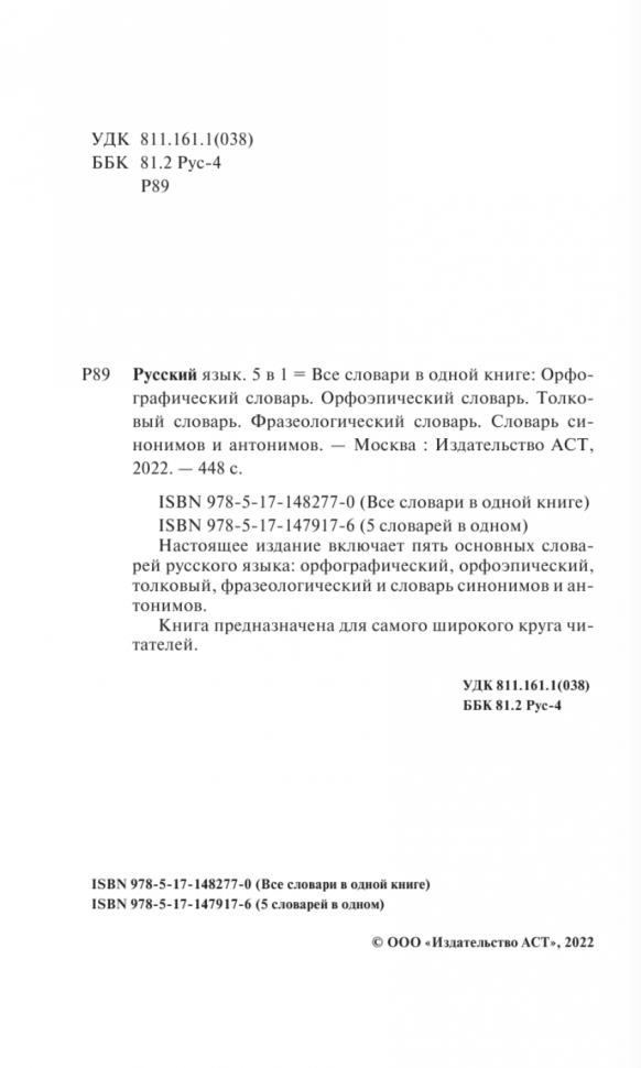 Русский язык. Все словари в одной книге. Орфографический словарь. Орфоэпический словарь. Толковый словарь. Фразеологический словарь. Словарь синонимов и антонимов (.); ИЗДАТЕЛЬСТВО "АСТ", 2022
