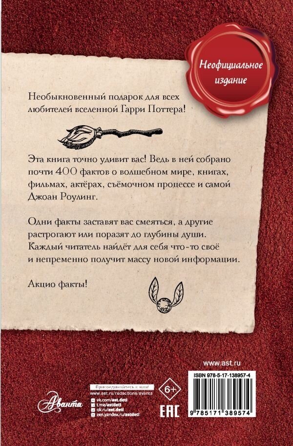 Факты, собранные в этом неофициальном издании, вряд ли покажутся вам такими уж удивительными, если вы давний поклонник Гарри Поттера и читали все книги (включая дополнения), смотрели все фильмы и интервью об их съемках, изучали статьи с Поттермо и т.д. Я являюсь поклонником вот уже 22 года, так что меня удивить этими фактами сложно, хотя пара из них все же справилась с поставленной задачей. Да и в целом, книга является приятным дополнением к коллекции, читается легко и быстро, а сколько приятных воспоминаний оживляет, будто ты снова ребенок, который окунулся в волшебную атмосферу вселенной Гарри Поттера.