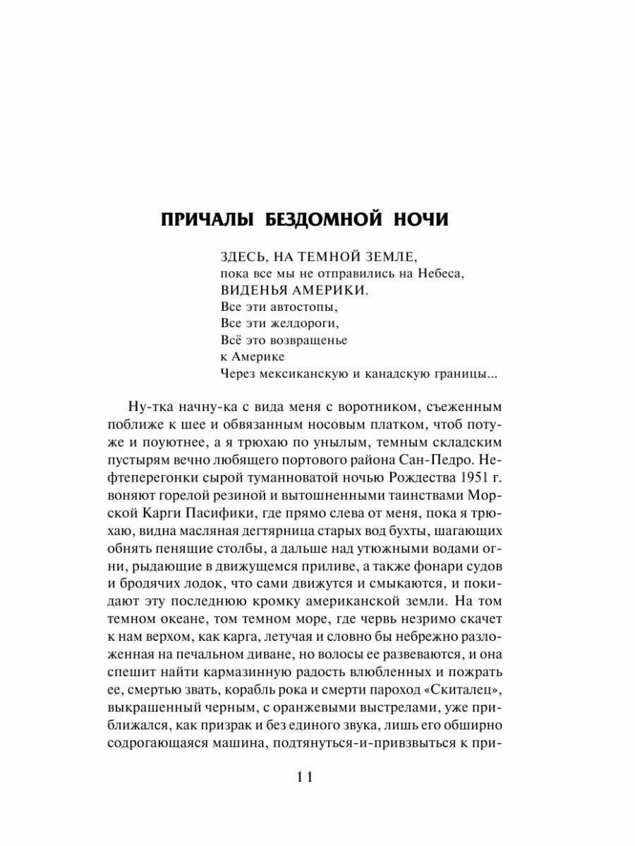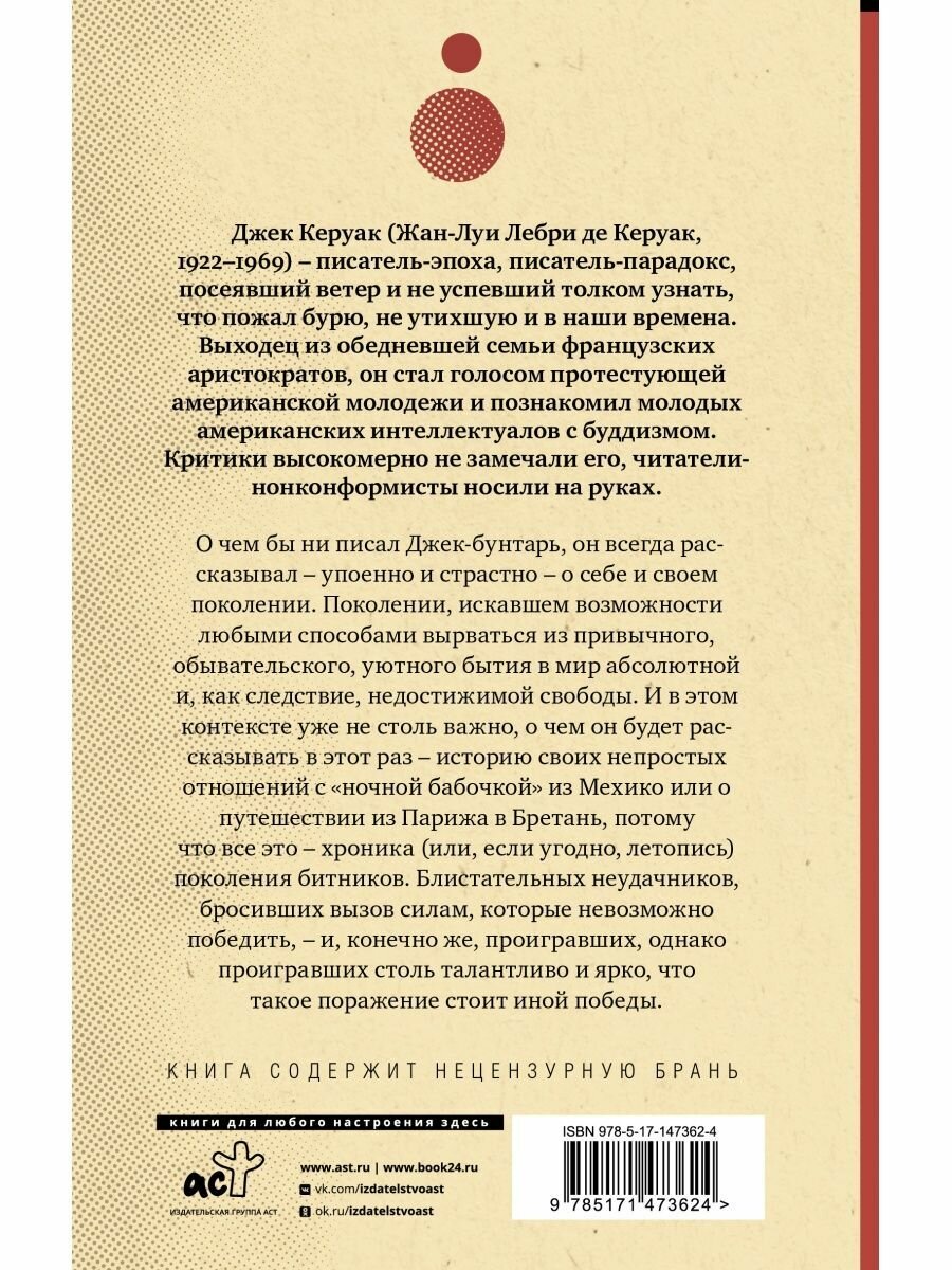 Не самые известные российскому читателю произведения Джека Керуака. Во всяком случае - издают их значительно реже основных работ его книжного каталога. Да и, по правде говоря, качеством они изрядно уступают тем же "В дороге" и "Ангелам Опустошения" (впрочем, в переводах М. Немцова полноценно воспринять творчество Керуака вряд ли представляется возможным). Однако фанатам автора - читать обязательно!.. И очередной вопрос к издателям: неужели Джек до сих пор не заслужил именной серии?.. Публиковать Керуака в "серии Паланика" - все равно, что издавать братьев Стругацких, к примеру, в "серии Пелевина".
