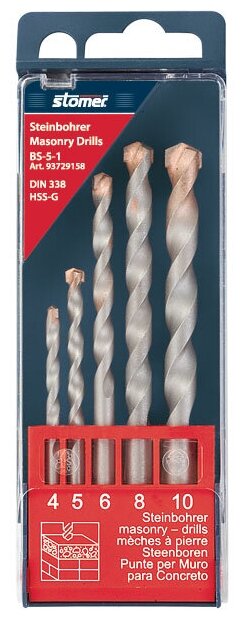 Набор сверл Stomer применяется совместно с дрелями для ударного сверления твердых материалов, таких как бетон, кирпич, камень, мрамор и т.д. Сверла изготовлены из усиленной инструментальной стали и имеют режущую кромку, благодаря которой оснастка не изнашивается длительное время. Имеют цилиндрический хвостовик.
