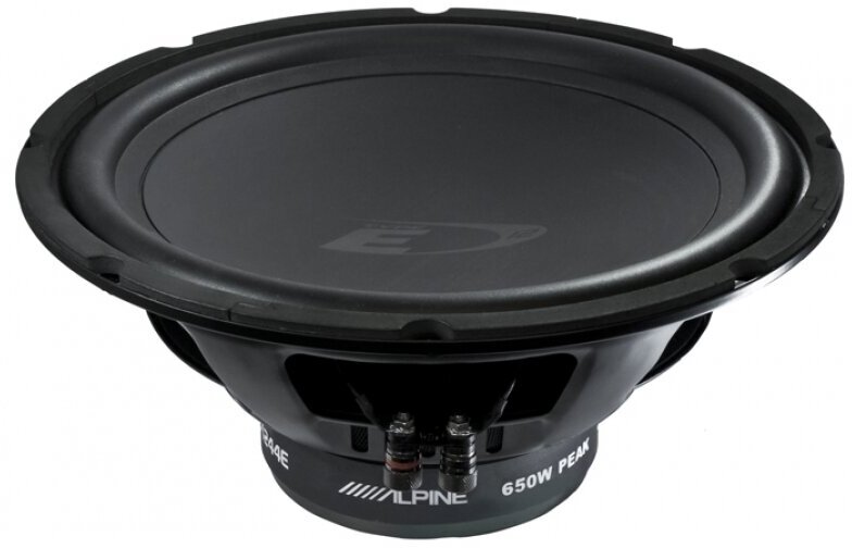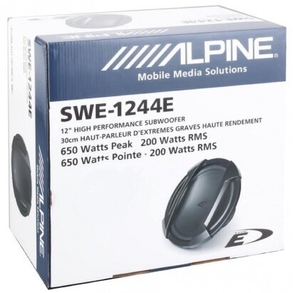 Серия сабвуферов Type-E – самая «младшая» у Alpine. А значит – самая доступная по стоимости. И хотя сабвуферы этой линейки и не претендуют на ураганную мощность, смело можно сказать, что они несут в себе фирменный подчерк Alpine. Высокое качество изготовления, надежность, долговечность и качественный бас – вот фамильные черты Alpine Type-E. Корзина сабвуферов отличается малой установочной глубиной. Конфигурация звуковой катушки – одиночная, с сопротивлением 4 Ом. В линейку входят две модели – 25-сантиметровая SWE-1044E и 30-сантиметровая SWE-1244E. Обе модели комплектуются защитной решеткой повышенной прочности, защищающий диффузор динамика от повреждений предметами в багажнике.