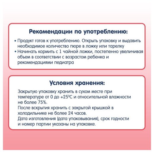 | Меры предосторожности | Закрытую упаковку хранить в сухом месте при температуре от 0°С до +25°С и относительной влажности не более 75%. После вскрытия хранить с закрытой крышкой в холодильнике не более 24 часов. Если упаковка вздута, не используйте продукт. Снимите крышку и уберите ее от малыша во избежание попадания в рот. Не оставляйте ребенка без присмотра во время кормления. Перед введением новых продуктов рекомендуем проконсультироваться с педиатром, который наблюдает малыша и знает все особенности его здоровья. |