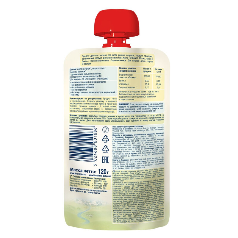 Пюре из яблок, груш и банана Fleur Alpine вобрало в себя самые сочные и спелые фрукты, выращенные на органическом сельском хозяйстве без использования пестицидов, химических удобрений, гормонов роста, ГМО и применения нанотехнологий. Гипоаллергенные сорта яблок богаты природными сахарами, органическими кислотами, витаминами и микроэлементами для гармоничного и полного развития ребенка. Груша содержит фолиевую кислоту, улучшающую кроветворение, а высокое содержание в банане витамина С оказывает антиоксидантное действие. Инновационная мягкая упаковка легка в использовании, а ее компактные размеры позволяют взять пюре на прогулку с малышом, чтобы дать ему перекусить в любое время. За закручивающейся крышечкой скрывается нежная кремообразная консистенция, которая не только полезна для здоровья, но и подарит малышу вкус и аромат спелых фруктов.