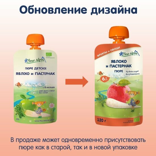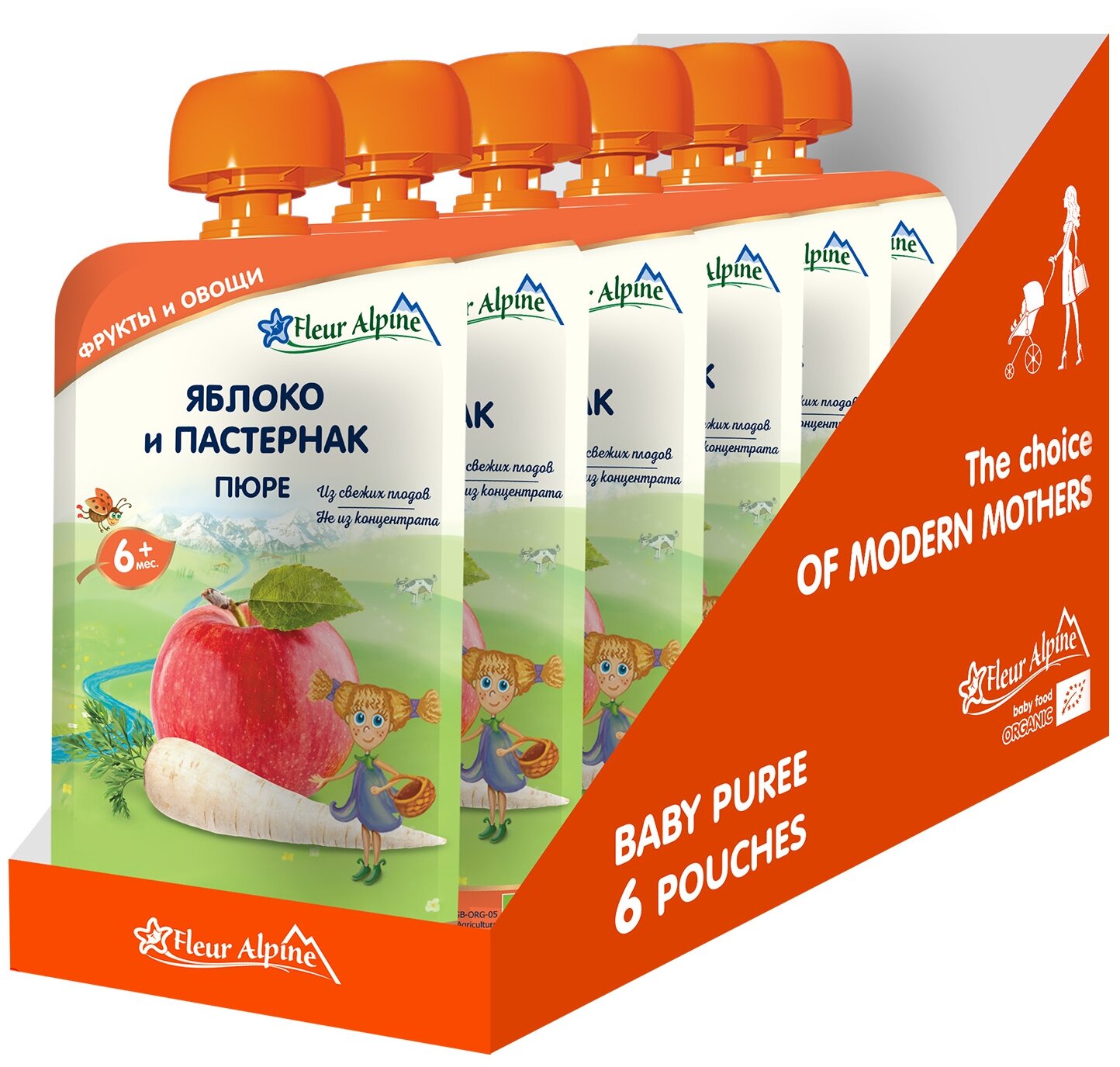 Пюре из яблок и пастернака Fleur Alpine вобрало в себя самые сочные и спелые фрукты и овощи, выращенные на органическом сельском хозяйстве без использования пестицидов, химических удобрений, гормонов роста, ГМО и применения нанотехнологий. Гипоаллергенные сорта яблок богаты природными сахарами, органическими кислотами, витаминами и микроэлементами для развития ребенка. Пастернак, богатый на содержание органическими кислотами, эфирными маслами и пищевыми волокнами, улучшает пищеварение и укрепляет стенки капиллярных сосудов. Инновационная мягкая упаковка легка в использовании, а ее компактные размеры позволяют взять пюре на прогулку с малышом, чтобы дать ему перекусить в любое время. За закручивающейся крышечкой скрывается нежная кремообразная консистенция, которая не только полезна для здоровья, но и подарит малышу вкус и аромат спелых фруктов и овощей.